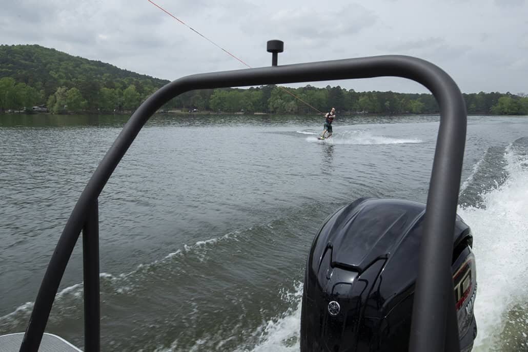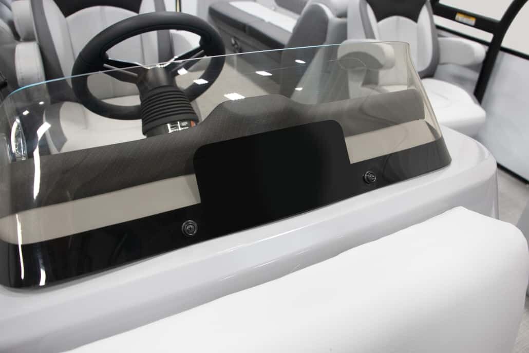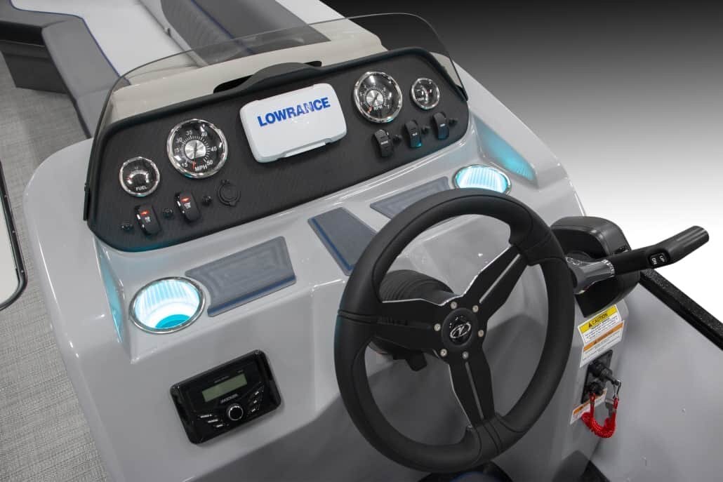 Patented All-Aluminum All-Welded Interlocking Deck System Fiberglass Console with Designer Dash HOOK 4X Graph Plotter Horn with Stainless Grill Marine Cooler Reclining Helm Seat Reclining Port Captain’s Chair L.E.D. Nav and Anchor Lights L.E.D. Courtesy Light on Console Woven Grey Vinyl Flooring Speed, Tach, Fuel, and Trim Gauges Stainless 6″ Deck Cleats Stainless Quick Release Bimini Hardware Lifting Strakes Integrated Performance Motor Pod Ratchet Mooring Cover Trash Receptacle 25″ Triple-toon Performance Package |