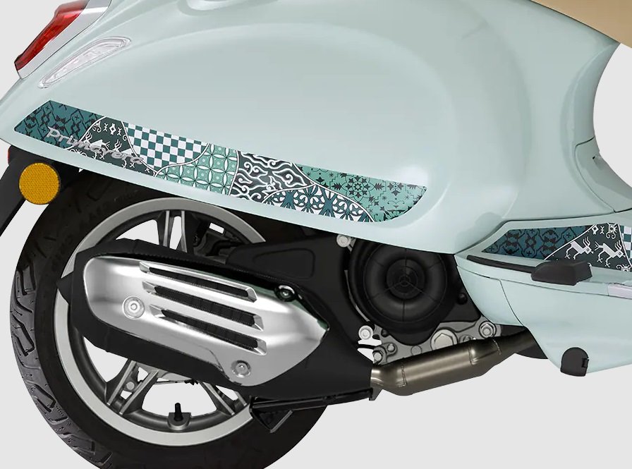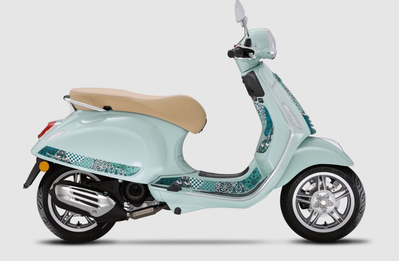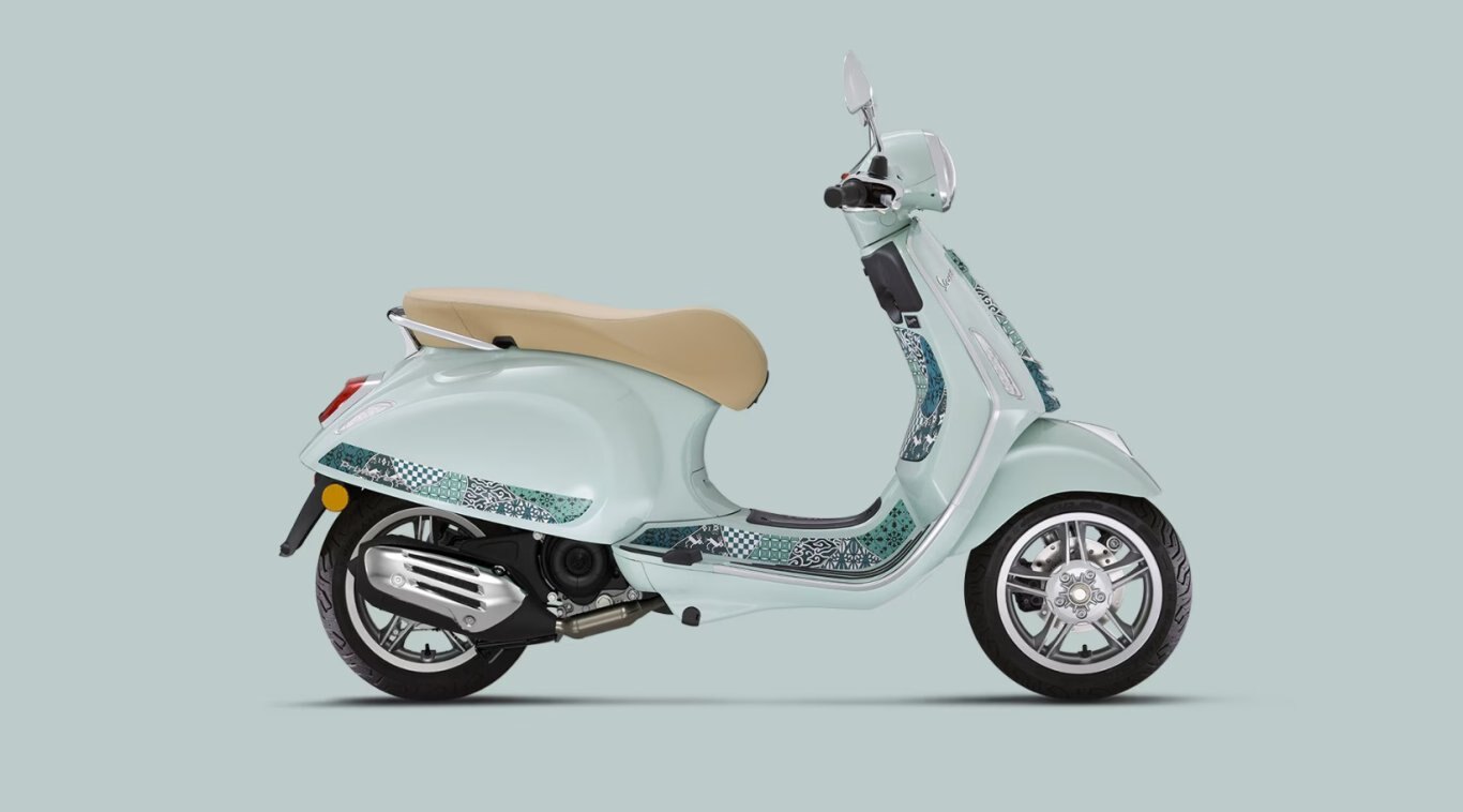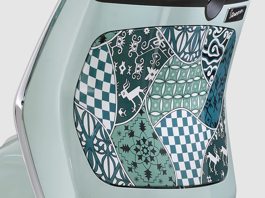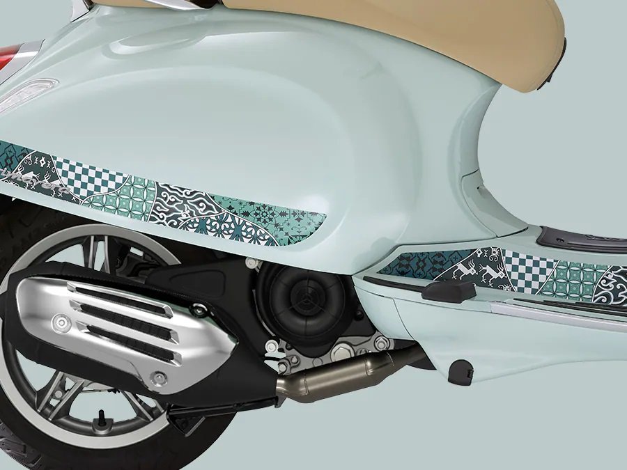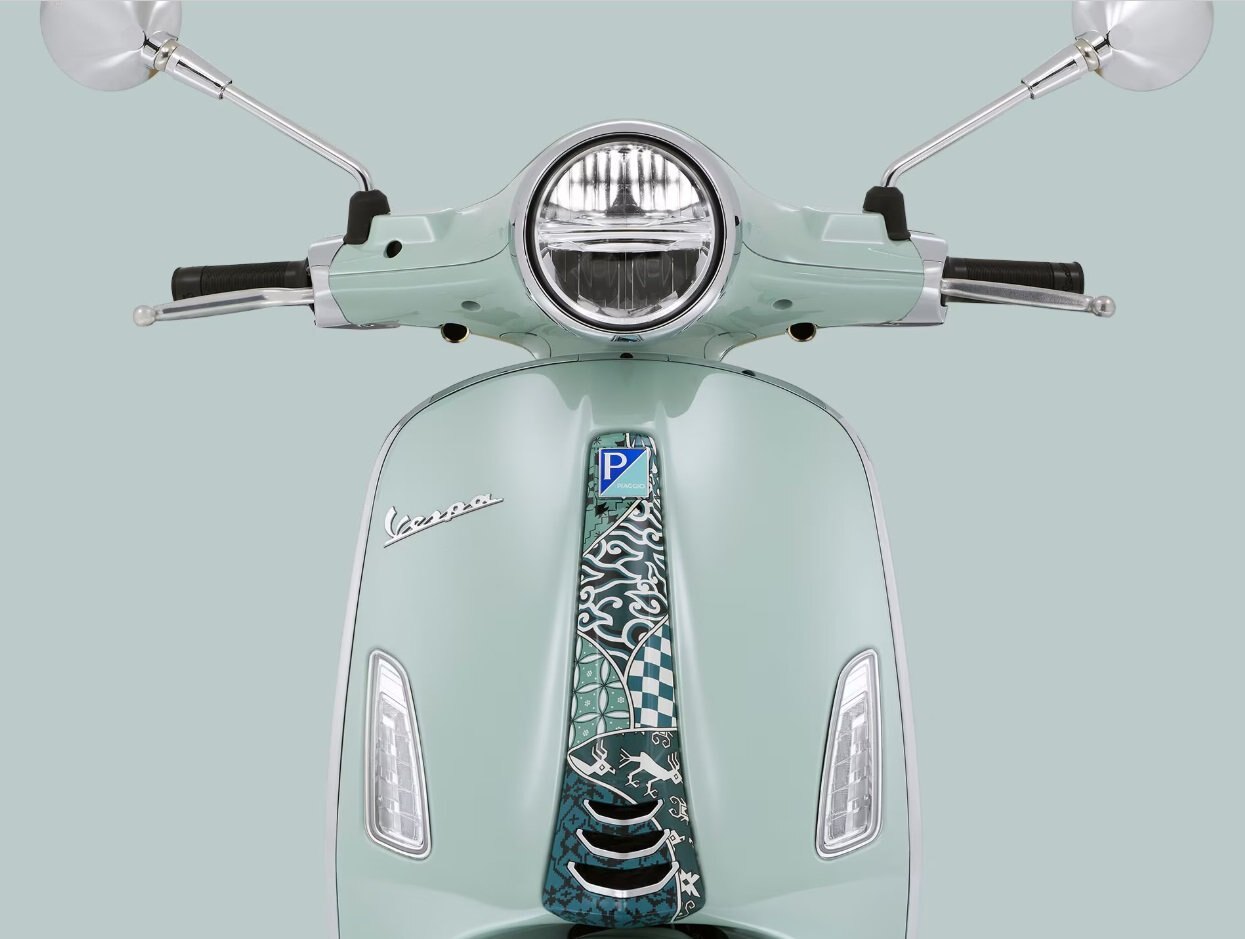 The Vespa Primavera Batik celebrates the fusion of the elegant lines of Italian design and the ancient art of batik. The base colour, Verde Amabile, is paired with a Tambal Jagad design comprising seven distinct motifs, each representing an island of the Indonesian archipelago and symbolising different virtues. The result is an immersion in the turquoise and white hues of a tropical beach, with sinuous lines that represent waves, for one of the most evocative models ever released throughout Vespa’s long and captivating history.