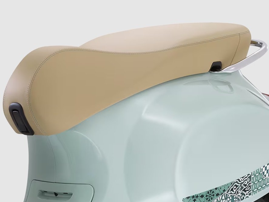 The comfy light-brown seat features green stitching for a stylish touch that recalls the base Verde Amabile green of the Vespa Primavera Batik.
