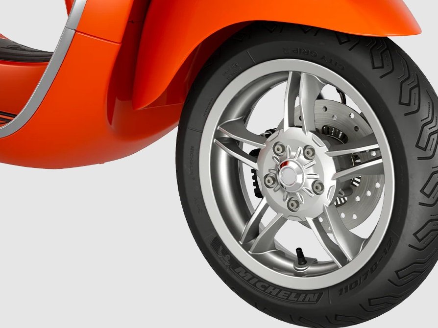 The rear guard, matte black battery cover and the elegant 5-spoke rims are just some of the many elements that make this Vespa truly special.