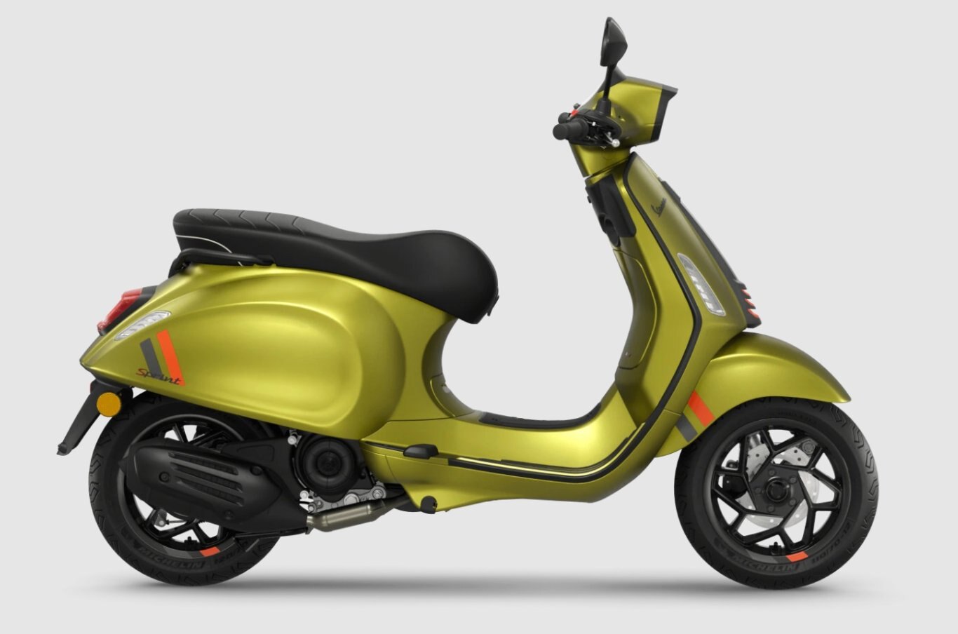 The Vespa S Sprint epitomises the distinctive character of generations of Vespa sporty models that bring a touch of dynamic spirit to any context. Its sporty look is emphasised by contrast-colour graphics, while black details such as the rectangular headlight frame and 6-spoke spiral aluminium rims add a sophisticated note.