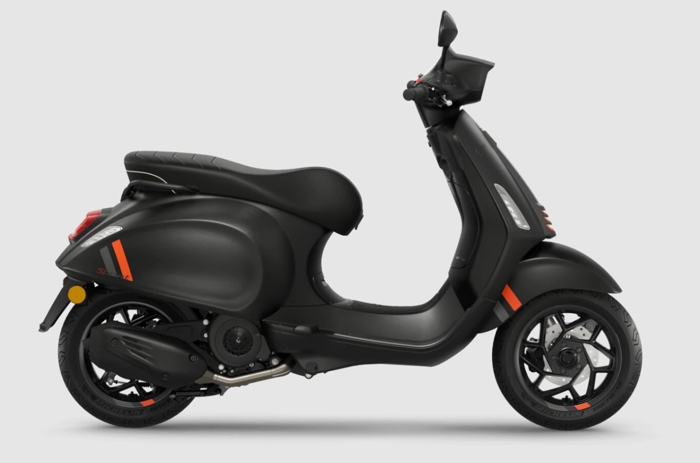 The Vespa S Sprint epitomises the distinctive character of generations of Vespa sporty models that bring a touch of dynamic spirit to any context. Its sporty look is emphasised by contrast-colour graphics, while black details such as the rectangular headlight frame and 6-spoke spiral aluminium rims add a sophisticated note.