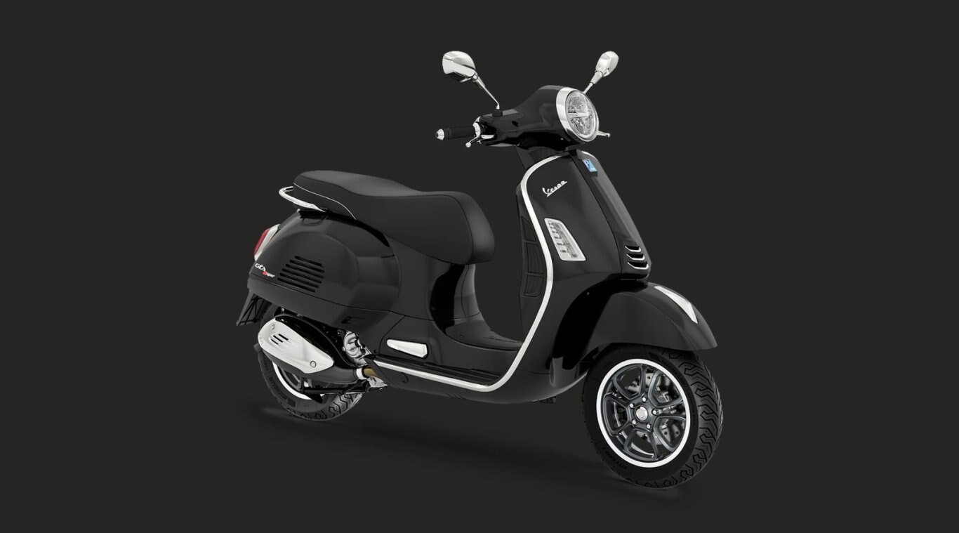 The Vespa Gts family's legendary aluminium frame is enhanced with chrome colours and black details such as the knobs, rubber footwell inserts and front shock absorber spring. The 12” wheels with 5-spoke rims in a graphite colour along with mirror-glossy sidewalls complete the bike's dynamic, personality-packed aesthetic.