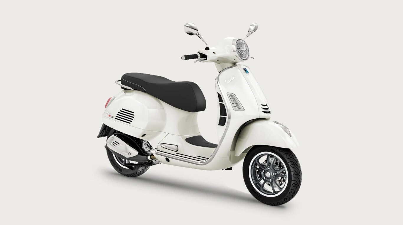 The Vespa Gts family's legendary aluminium frame is enhanced with chrome colours and black details such as the knobs, rubber footwell inserts and front shock absorber spring. The 12” wheels with 5-spoke rims in a graphite colour along with mirror-glossy sidewalls complete the bike's dynamic, personality-packed aesthetic.