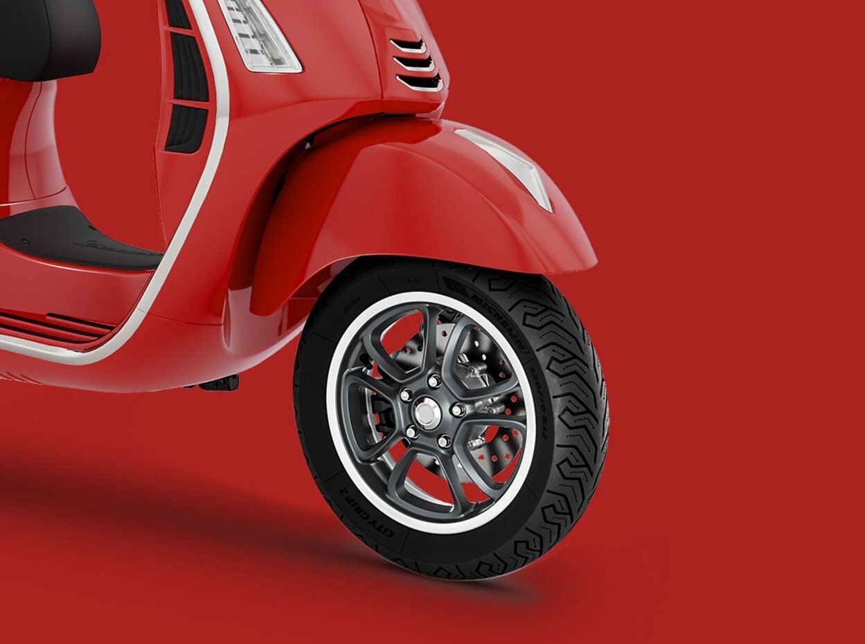 The Vespa Gts family's legendary aluminium frame is enhanced with chrome colours and black details such as the knobs, rubber footwell inserts and front shock absorber spring. The 12” wheels with 5-spoke rims in a graphite colour along with mirror-glossy sidewalls complete the bike's dynamic, personality-packed aesthetic.