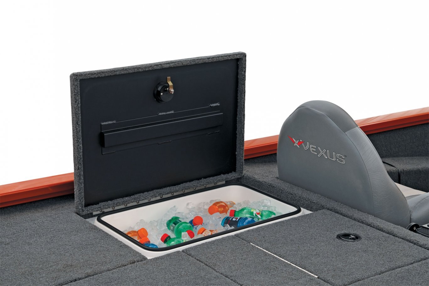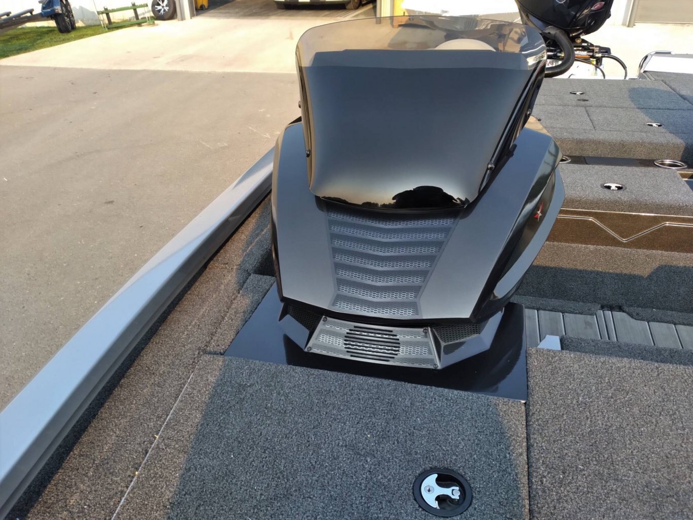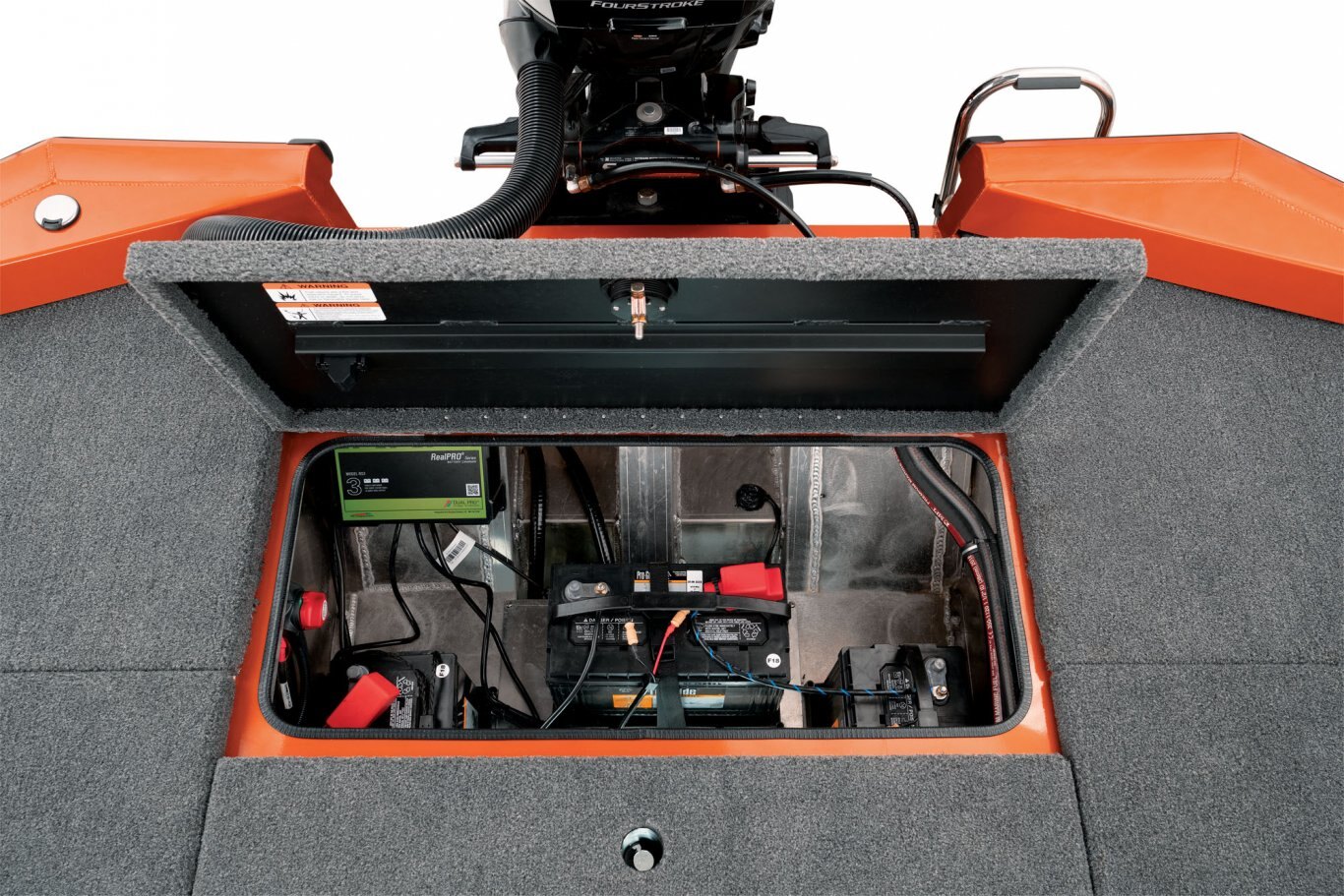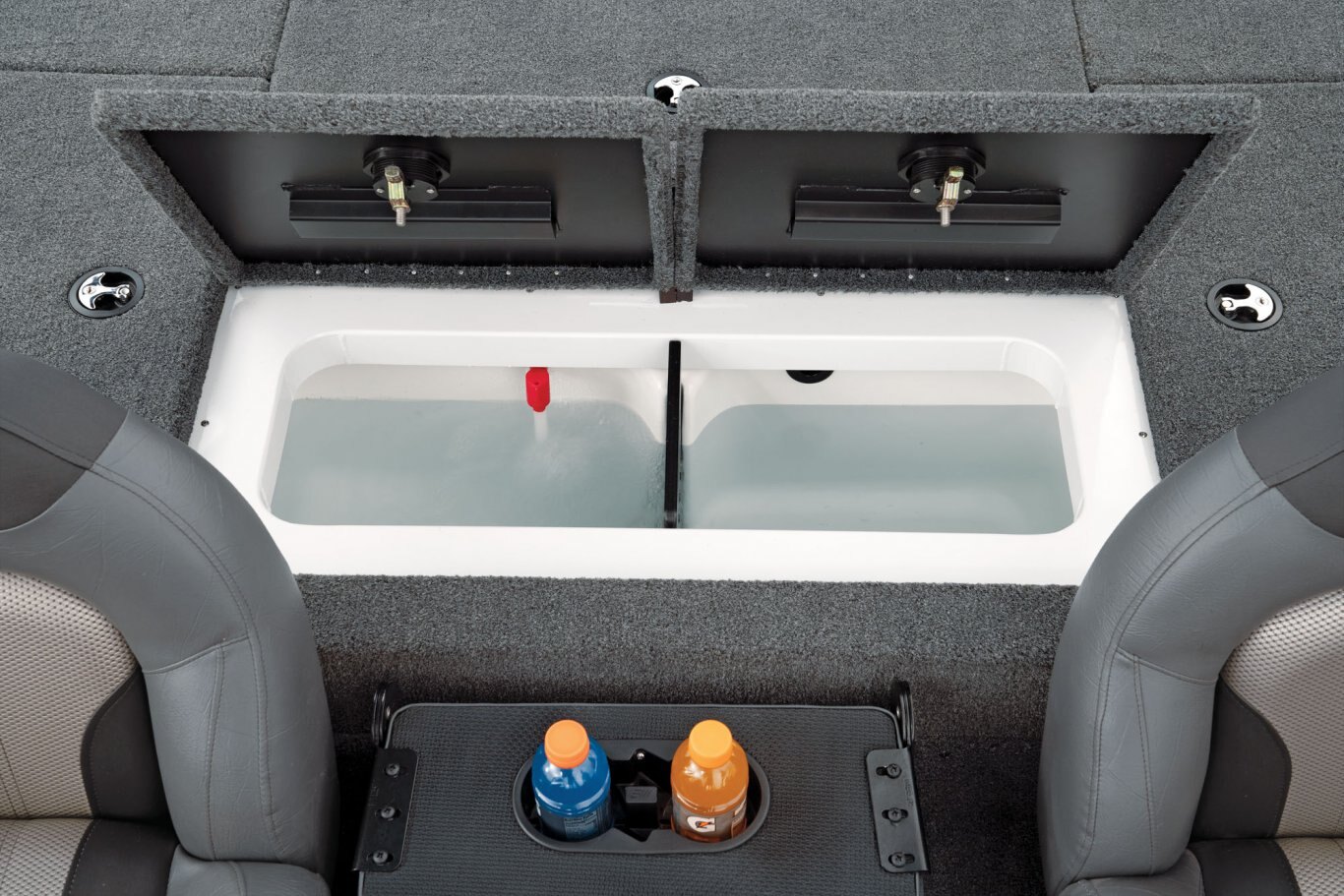 Looking aft, large fiberglass storages are insulated and feature the added confidence of raised lip seals and compression locks for the ultimate in wet-weather readiness. The tournament-inspired livewell is equipped with an anti-splash ring, removable divider, recirculating aeration, and an auto pump-out. There’s even more convenience with an available remote drain plug. At the stern, the rear power compartment is designed for trouble-free access to the bilge, batteries, pumps, and additional gear. The area also includes a main power switch and room for additional gear like a spare prop and shallow water anchor pump.
