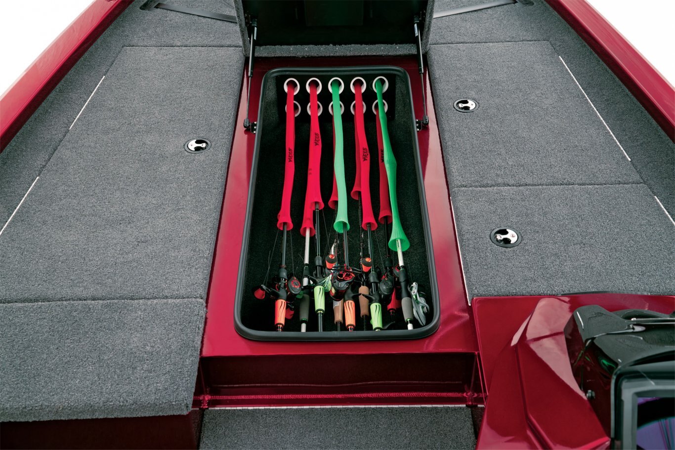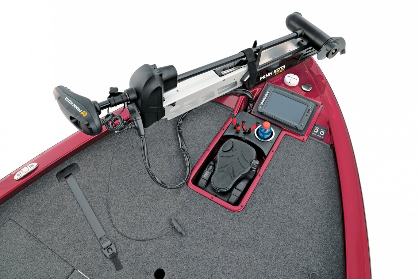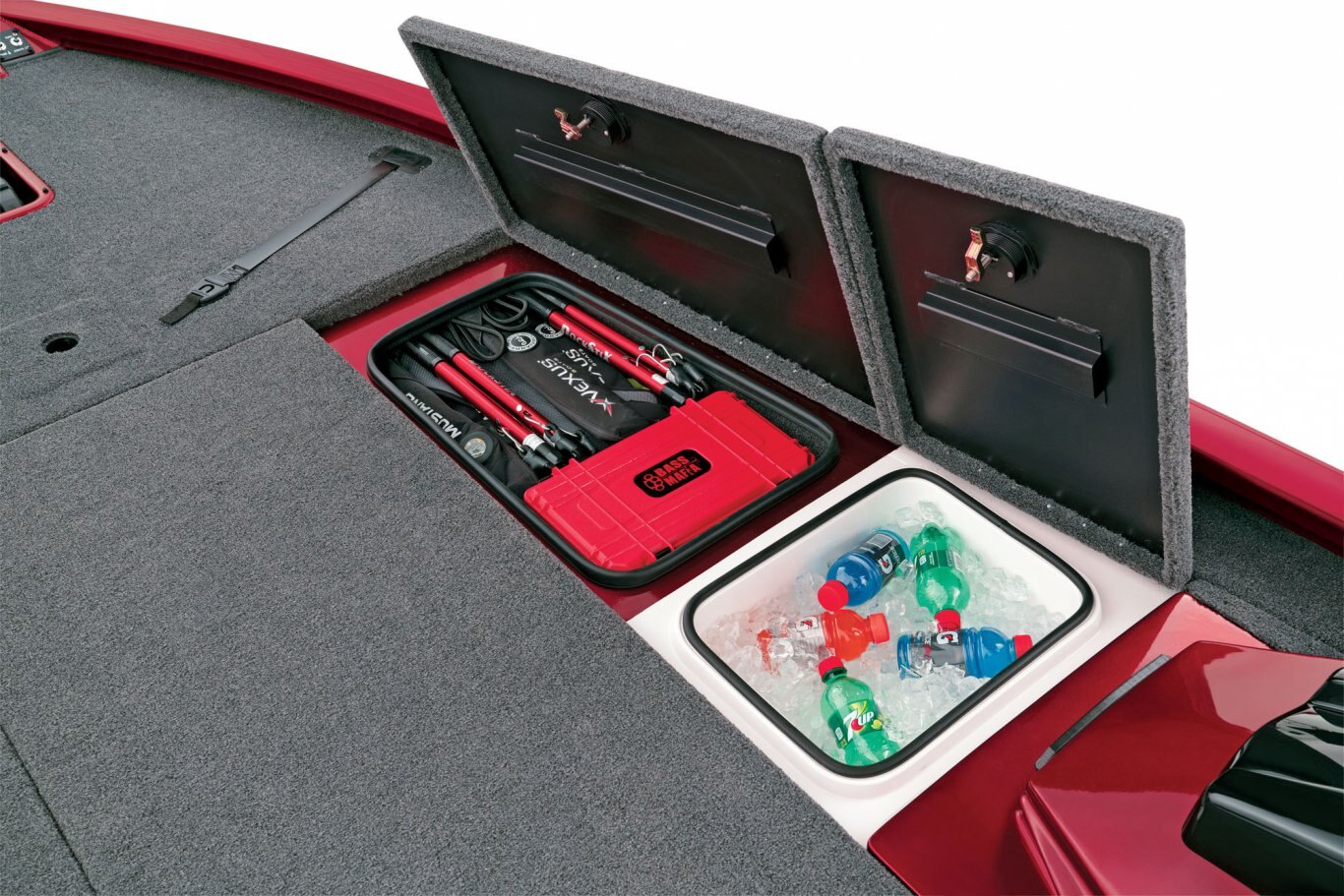 Inside the broad 95” beam, stretch-form gunnels surround a pair of massive decks loaded with storage space. A Minn Kota Ultrex commands the bow while our exclusive, glass-infused recessed trolling motor station includes cup and tool holders as well as room for up to 9" flush-mounted electronics on the bow panel. The center rod box carries room for sticks up to 8 ½’ in length while the port side easily holds 7’10” rods. The starboard compartment features room for more gear and there’s an insulated cooler just forward of the console. The locking deck storages also include raised lips, a rubber trim seal, and stainless-steel compression locks for exceptional wet weather protection.
