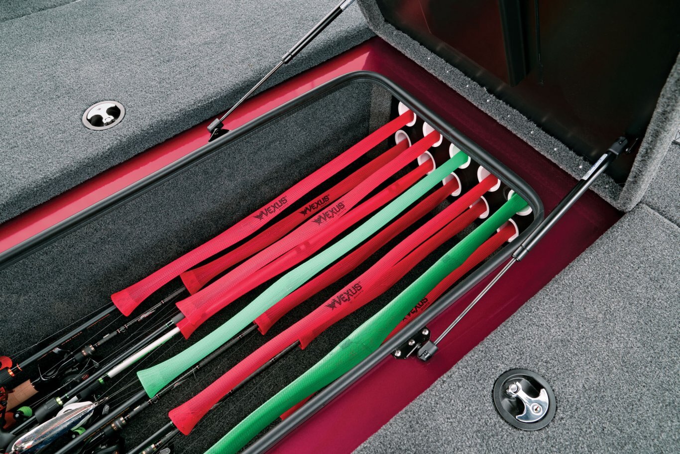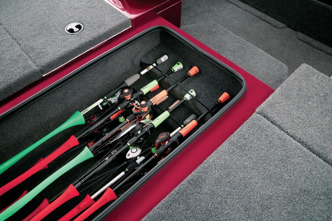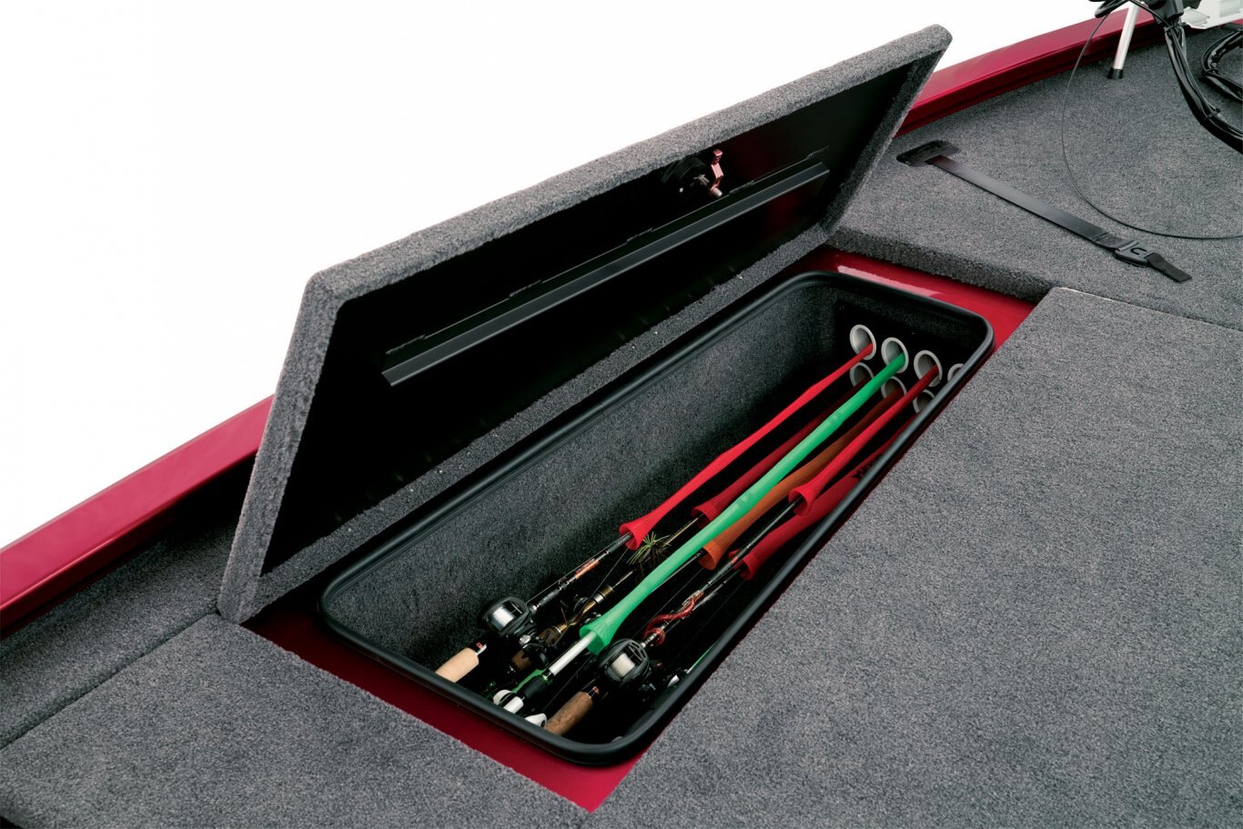 Inside the broad 95” beam, stretch-form gunnels surround a pair of massive decks loaded with storage space. A Minn Kota Ultrex commands the bow while our exclusive, glass-infused recessed trolling motor station includes cup and tool holders as well as room for up to 9" flush-mounted electronics on the bow panel. The center rod box carries room for sticks up to 8 ½’ in length while the port side easily holds 7’10” rods. The starboard compartment features room for more gear and there’s an insulated cooler just forward of the console. The locking deck storages also include raised lips, a rubber trim seal, and stainless-steel compression locks for exceptional wet weather protection.