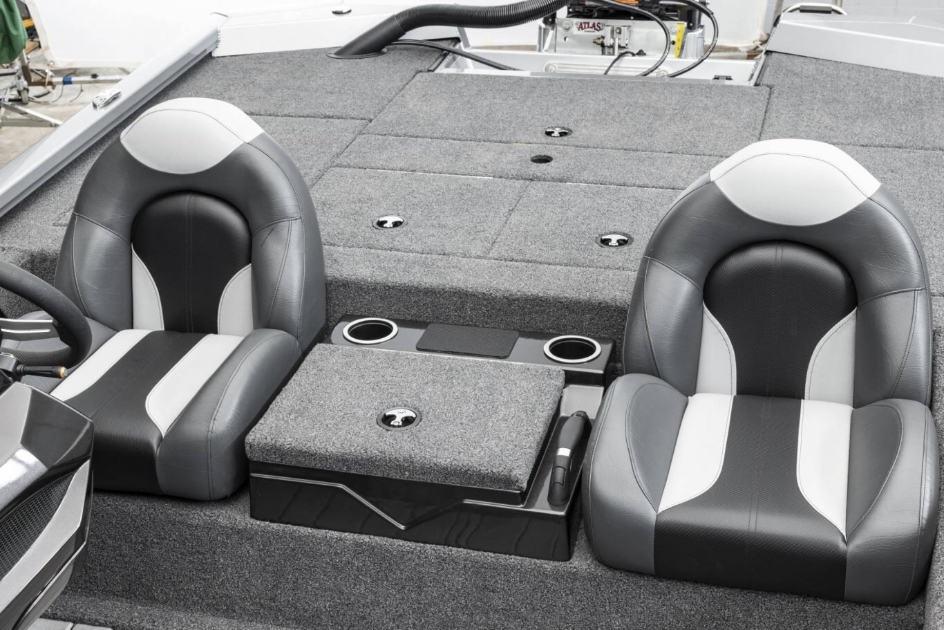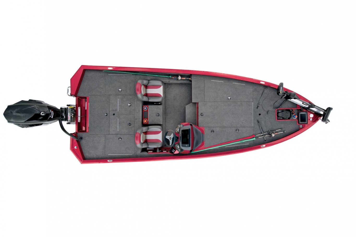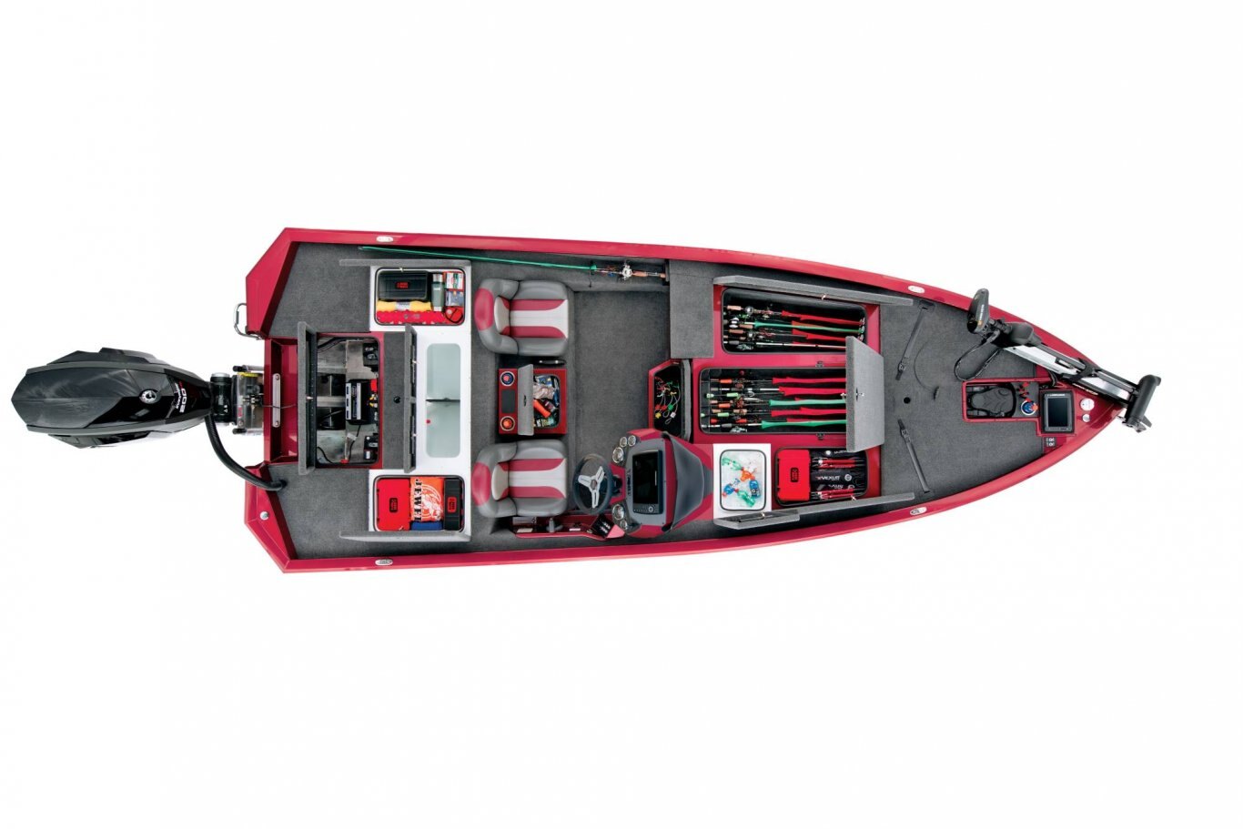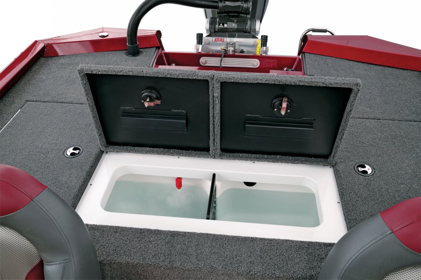 Looking aft, the rear side storages are not only up to 3 times larger than other aluminum rigs but they’re also made of reinforced fiberglass (not plastic). Plus, they’re insulated and designed for all-weather protection of your gear. The tournament-inspired livewell is equally well-equipped with an anti-splash ring, divider, and pump-out; no more wet hands trying to drain the well. At the stern, the rear power compartment is cavernous, with easy access to batteries, pumps and the bilge. It’s a wide-open world with plenty of room for additional gear like a spare prop, tools, and shallow water anchor pump.