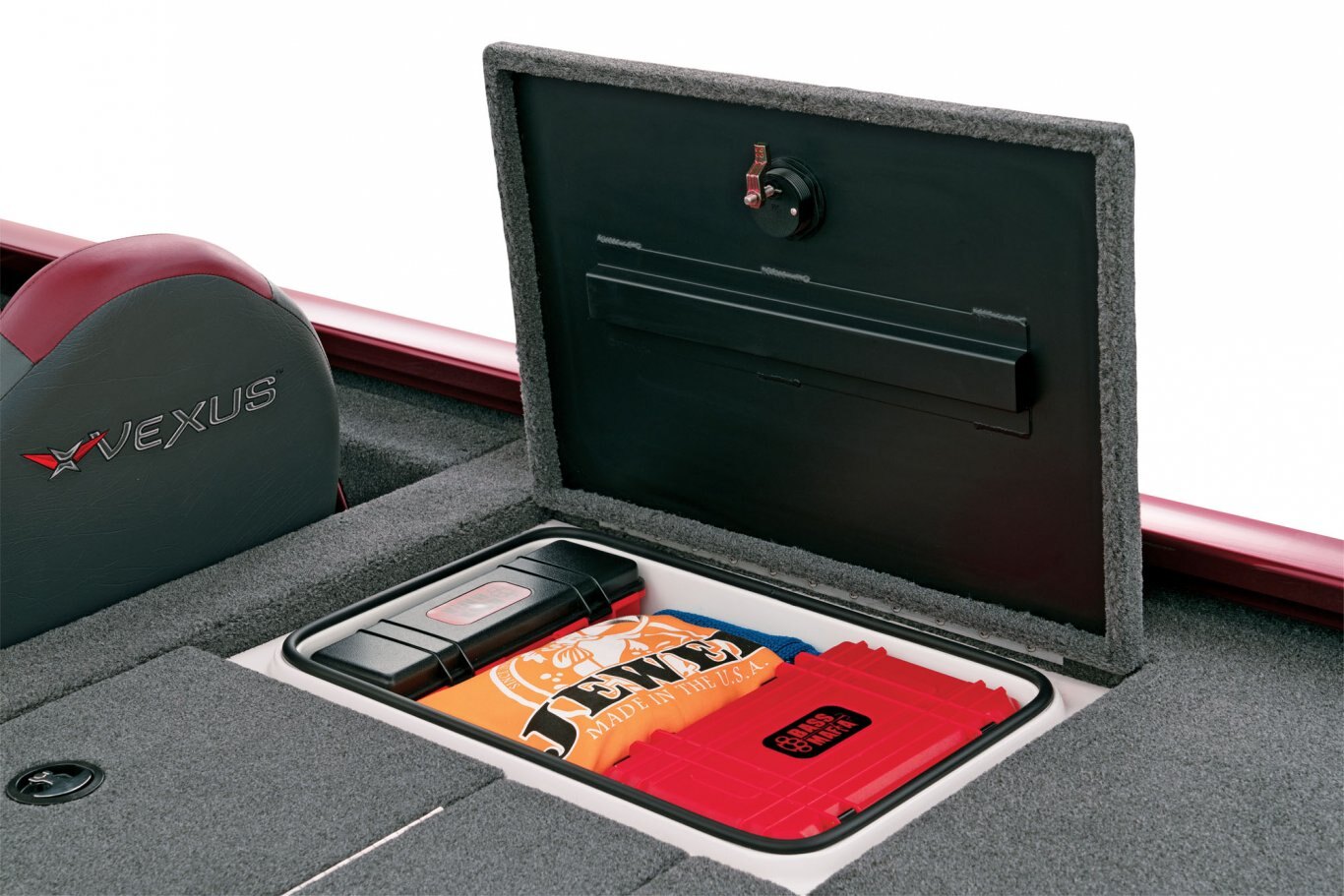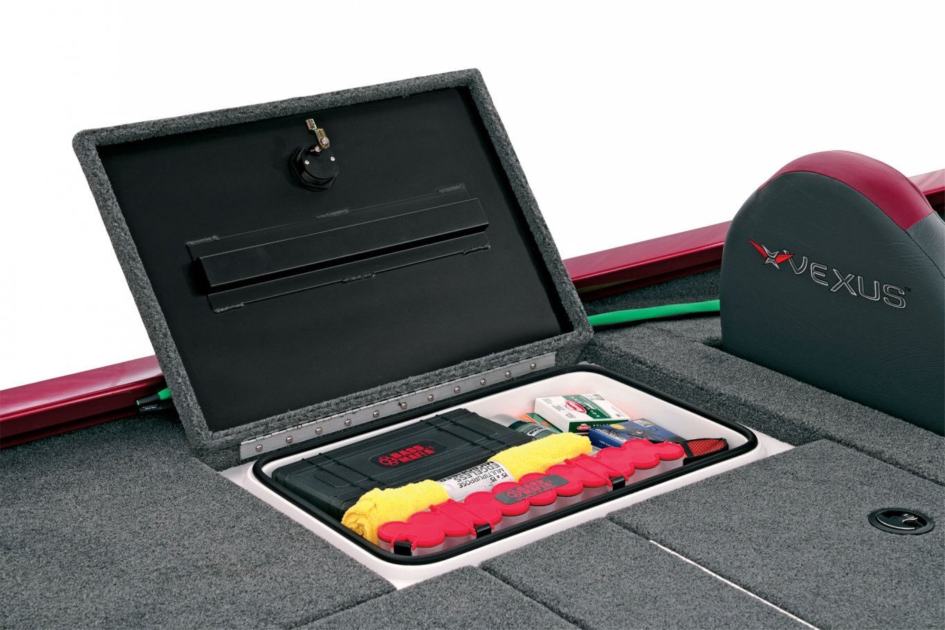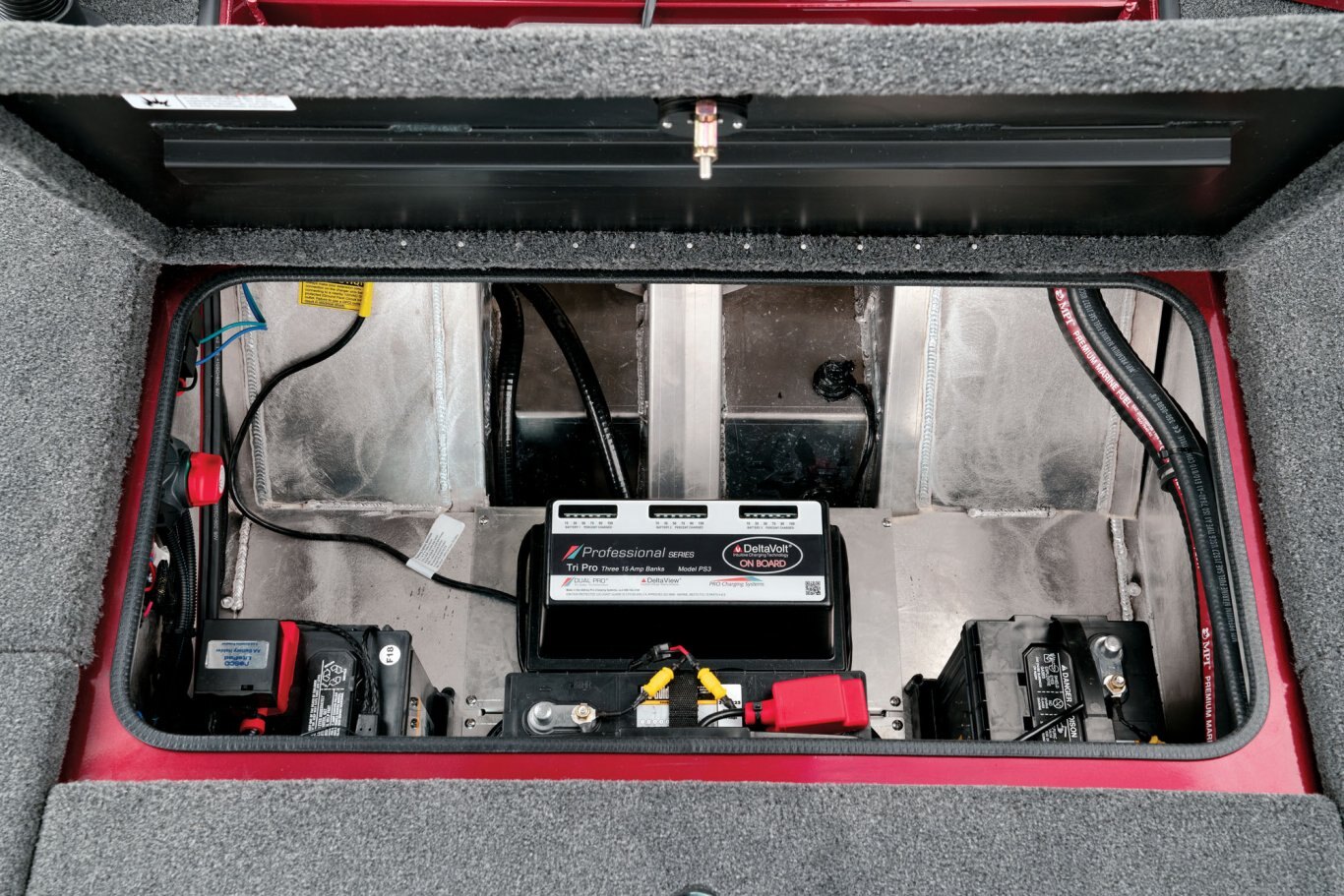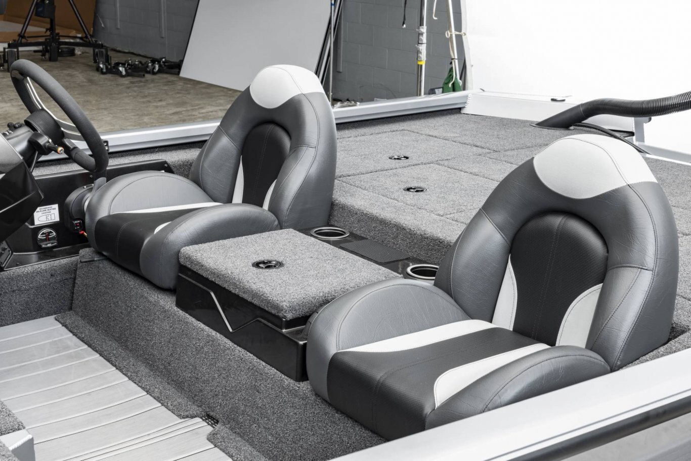 Looking aft, the rear side storages are not only up to 3 times larger than other aluminum rigs but they’re also made of reinforced fiberglass (not plastic). Plus, they’re insulated and designed for all-weather protection of your gear. The tournament-inspired livewell is equally well-equipped with an anti-splash ring, divider, and pump-out; no more wet hands trying to drain the well. At the stern, the rear power compartment is cavernous, with easy access to batteries, pumps and the bilge. It’s a wide-open world with plenty of room for additional gear like a spare prop, tools, and shallow water anchor pump.