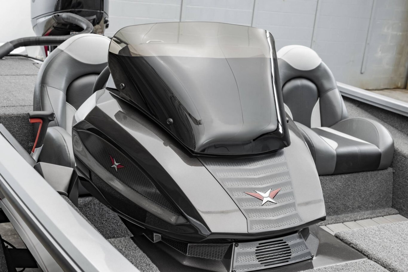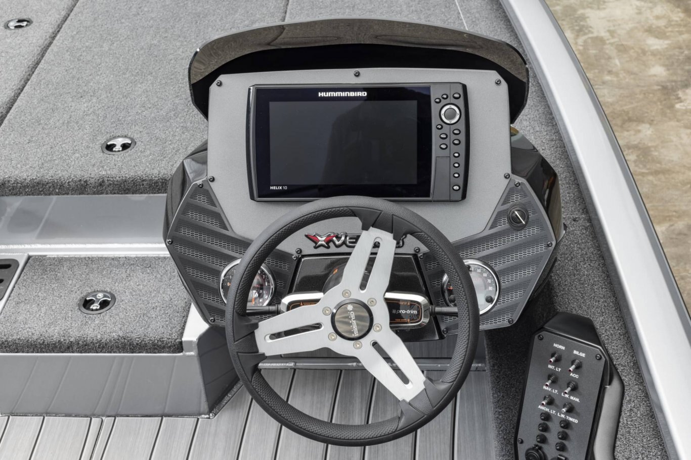 At the helm,the glass-infused console is positioned for an abundance of leg room and the finished lower contours make it easy to move quickly in and out of the seat. Elsewhere, speed, tach, fuel, trim, and water pressure gauges are standard and there’s room to flush-mount up to 12” electronics. Also in the cockpit, lit-tip rocker switches are located for easy access and high performance bucket seats are designed with contour-hugging leg and lateral support. A third seat or center coin box/step is also available. There’s even a central step to the front deck with bonus storage for smaller items. Extra features like a remote drain plug and driver’s side seat slide come standard in our Victor™ package.