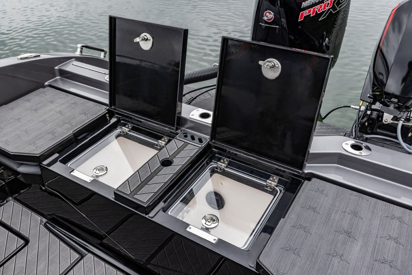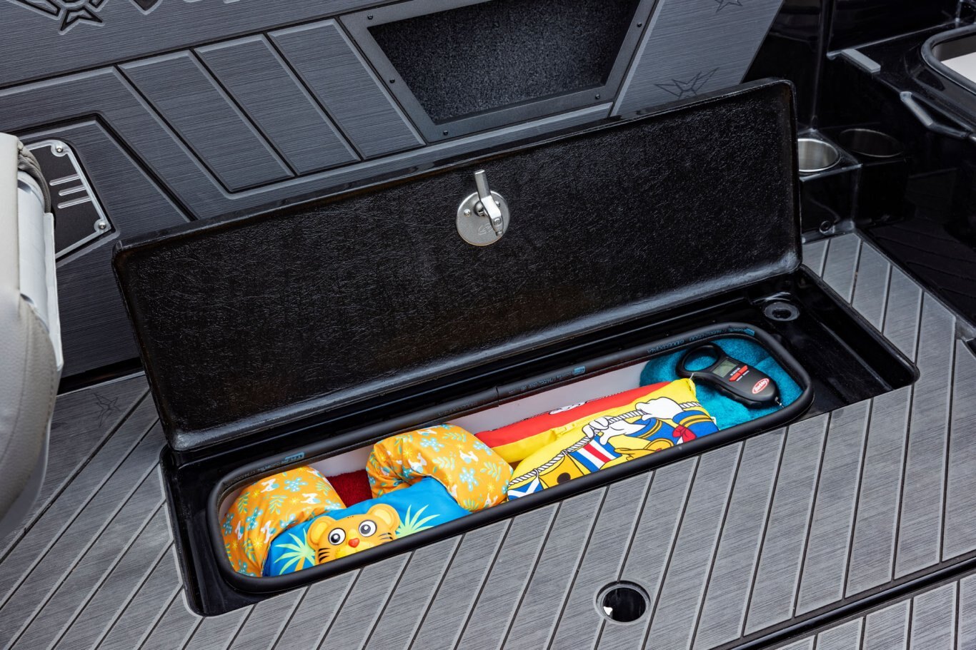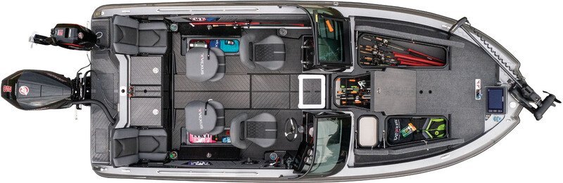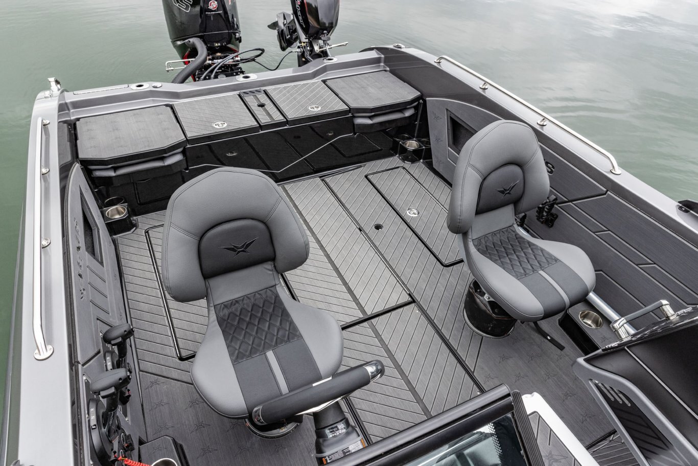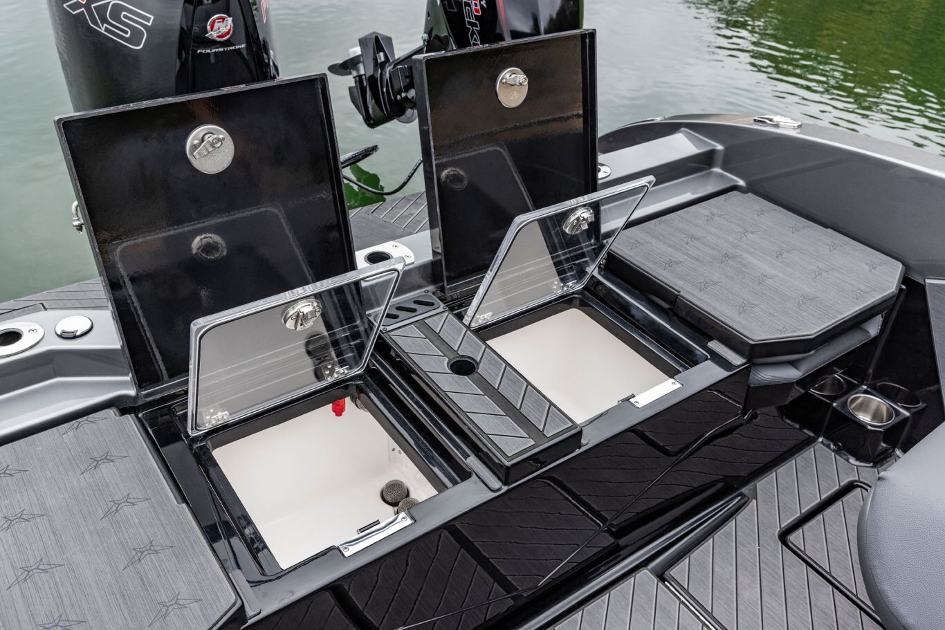 Near the Firm-Set™ windshield, a removable cooler serves double duty as a step to the front deck. You’ll also notice a pair of pullout storage bins just below the consoles. The port side is on a retracting slide and is ideal for holding up to six, 3700-style tackle trays. The corresponding compartment under the helm can hold even more of these boxes. It also works well as a catch-all or litter caddy. Looking aft, a pair of plush, jump seats are equally spacious. Flipped down, they help extend the rear deck. When completely up, you’ll find another set of sealed compartments that can also be used as coolers. In between these convertible seats is a tournament-level livewell with clear view lids for easy culling and quick checks of the catch.