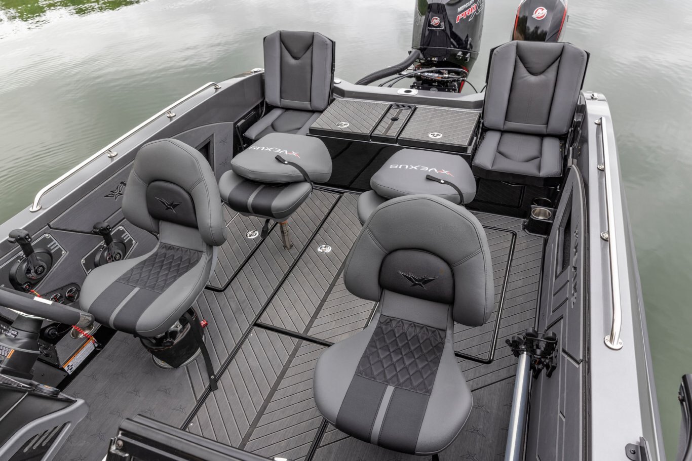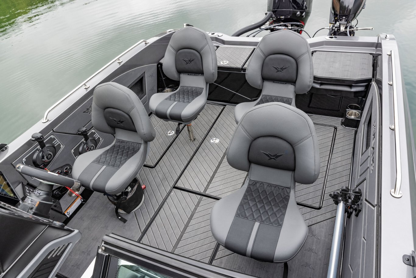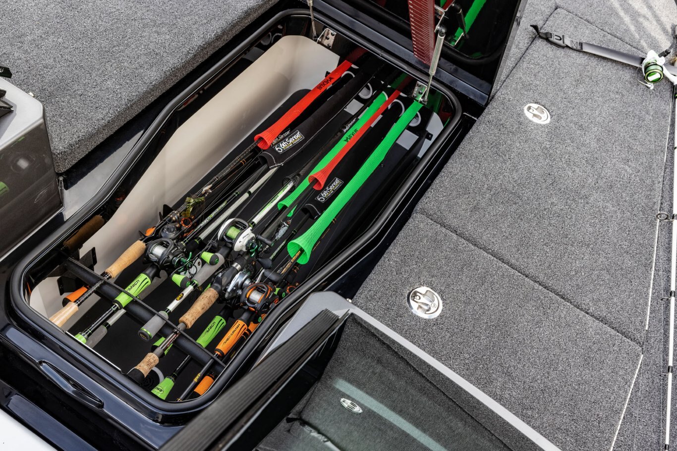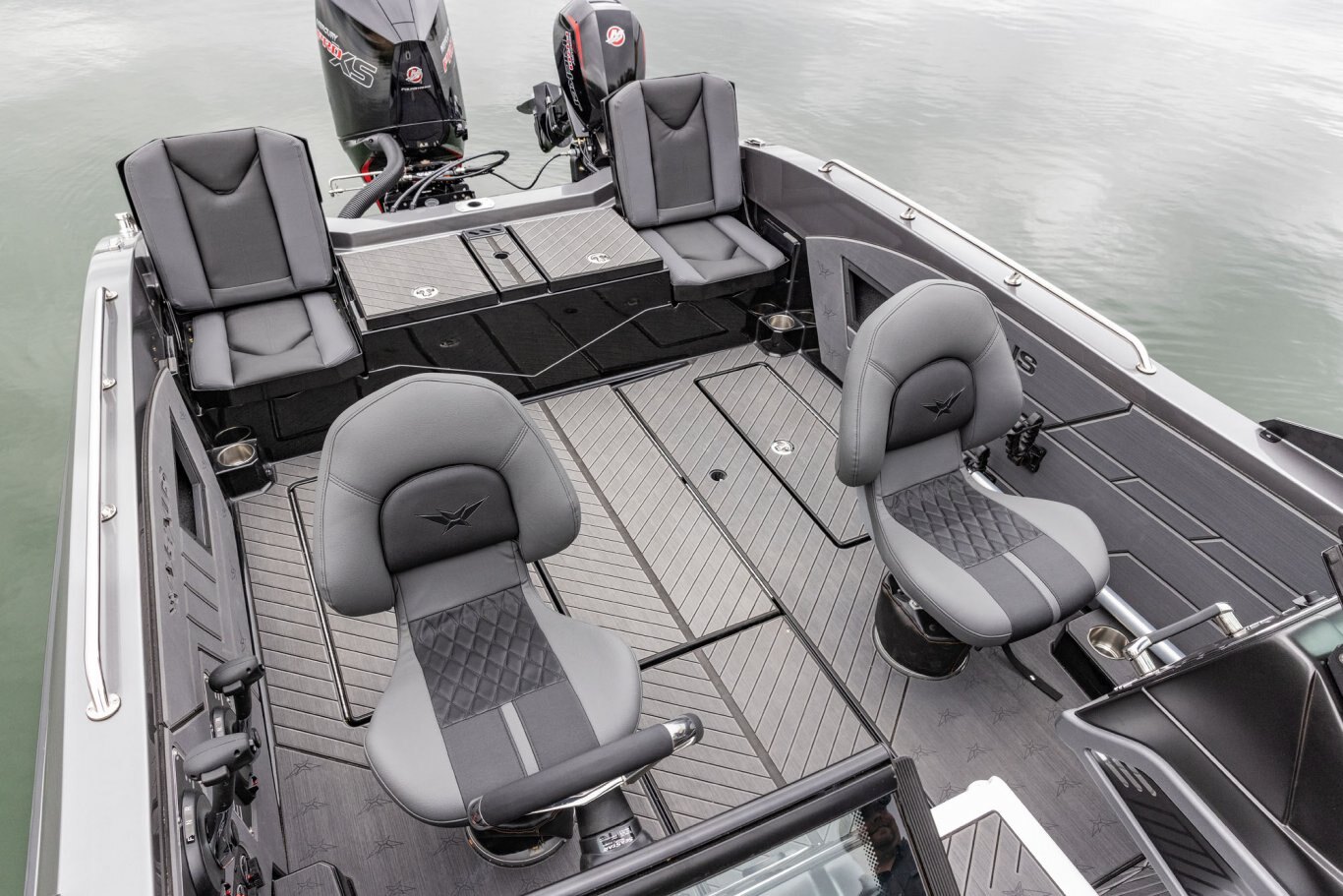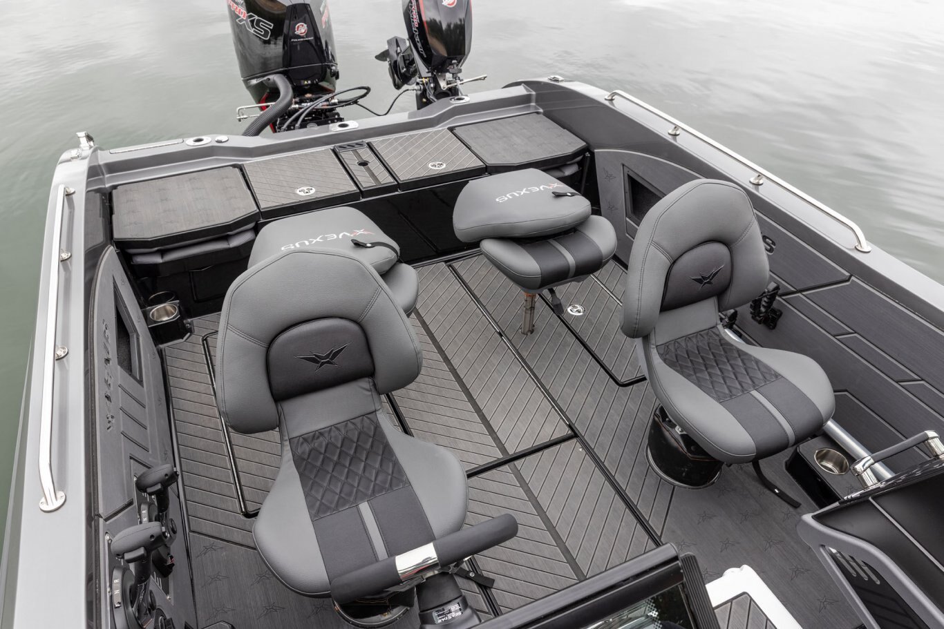 Near the Firm-Set™ windshield, a removable cooler serves double duty as a step to the front deck. You’ll also notice a pair of pullout storage bins just below the consoles. The port side is on a retracting slide and is ideal for holding up to six, 3700-style tackle trays. The corresponding compartment under the helm can hold even more of these boxes. It also works well as a catch-all or litter caddy. Looking aft, a pair of plush, jump seats are equally spacious. Flipped down, they help extend the rear deck. When completely up, you’ll find another set of sealed compartments that can also be used as coolers. In between these convertible seats is a tournament-level livewell with clear view lids for easy culling and quick checks of the catch.