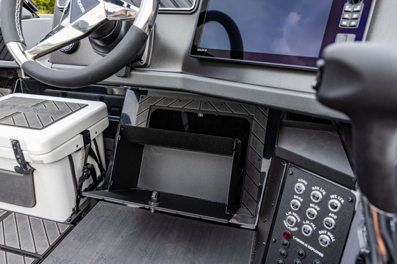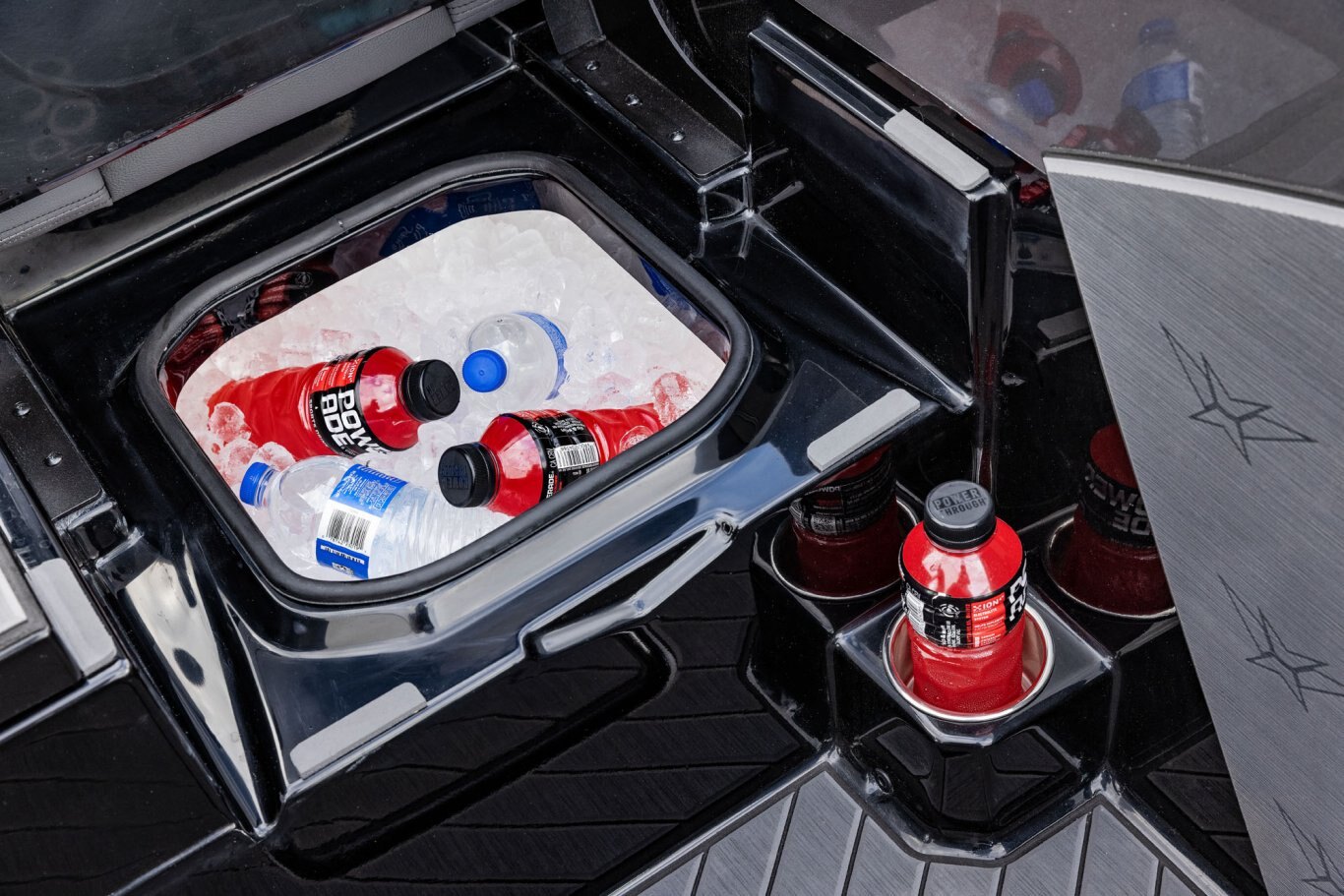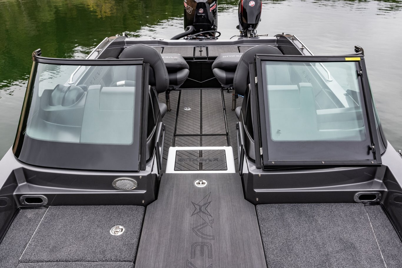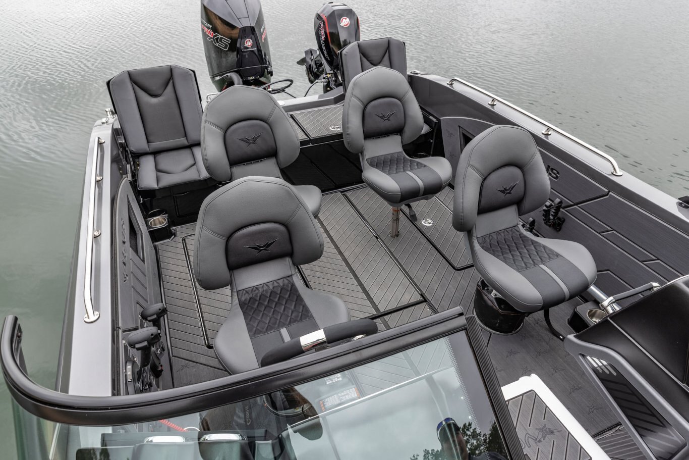 Near the Firm-Set™ windshield, a removable cooler serves double duty as a step to the front deck. You’ll also notice a pair of pullout storage bins just below the consoles. The port side is on a retracting slide and is ideal for holding up to six, 3700-style tackle trays. The corresponding compartment under the helm can hold even more of these boxes. It also works well as a catch-all or litter caddy. Looking aft, a pair of plush, jump seats are equally spacious. Flipped down, they help extend the rear deck. When completely up, you’ll find another set of sealed compartments that can also be used as coolers. In between these convertible seats is a tournament-level livewell with clear view lids for easy culling and quick checks of the catch.