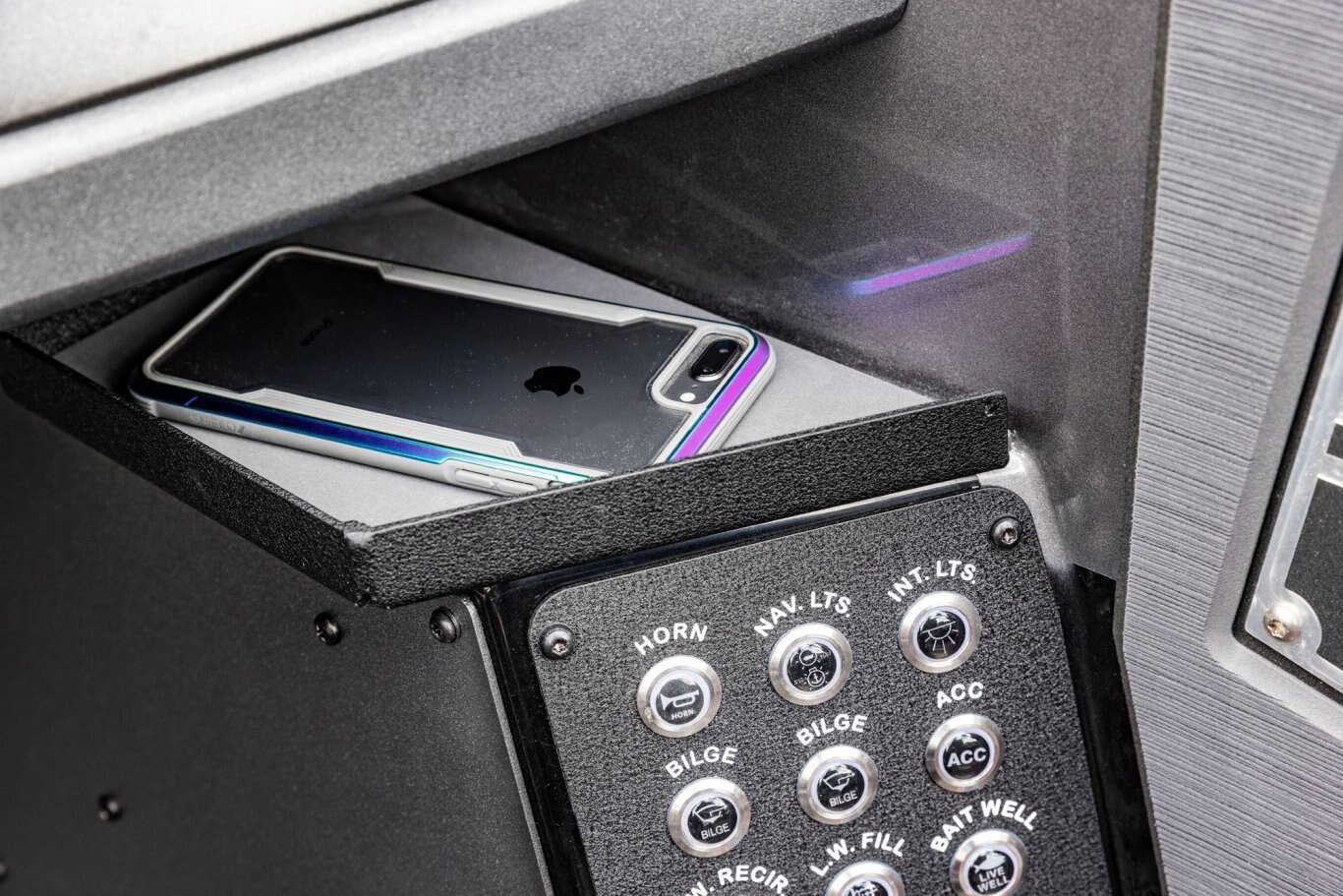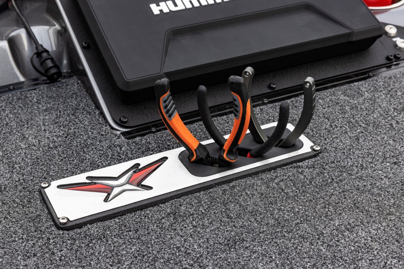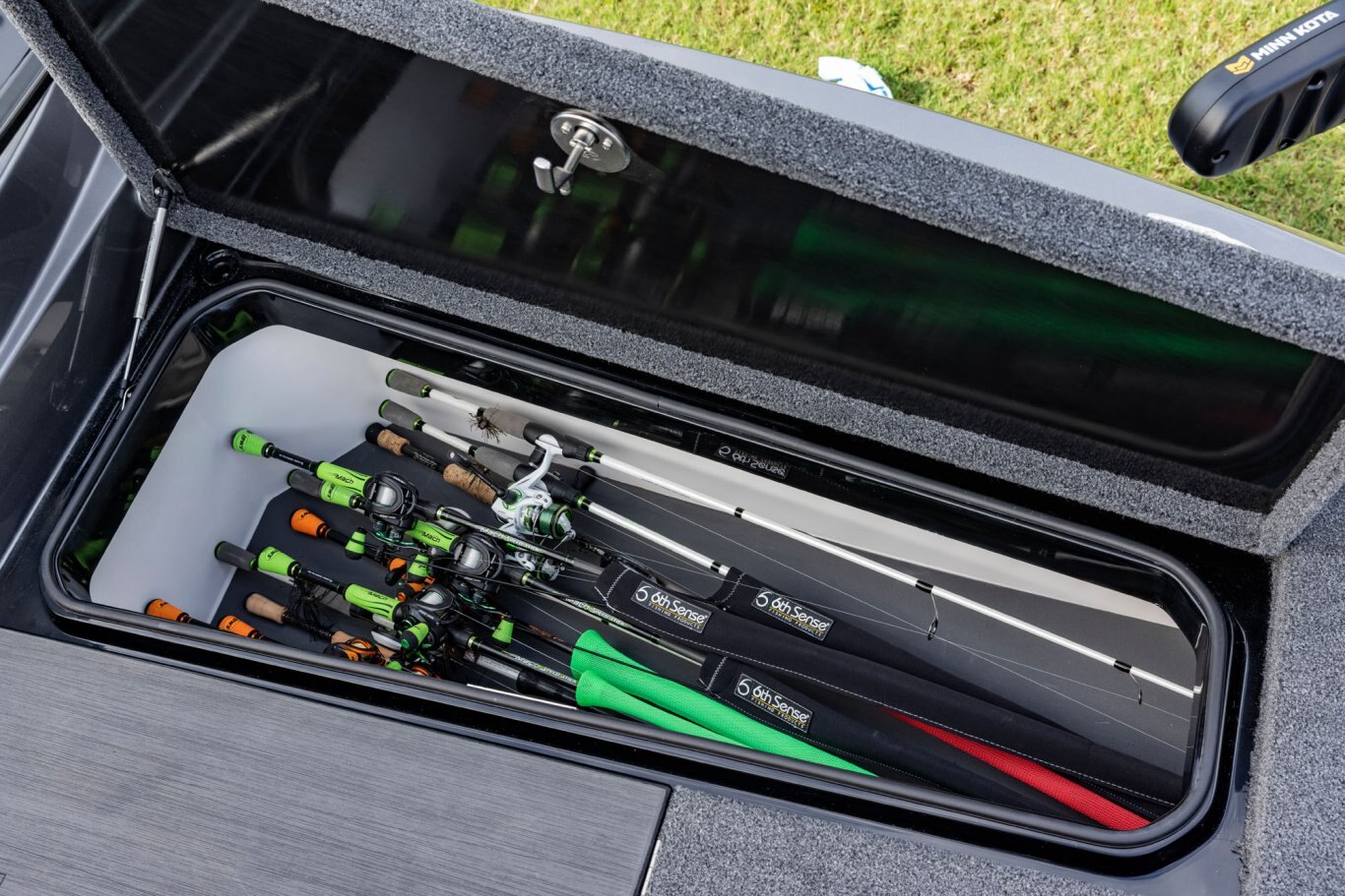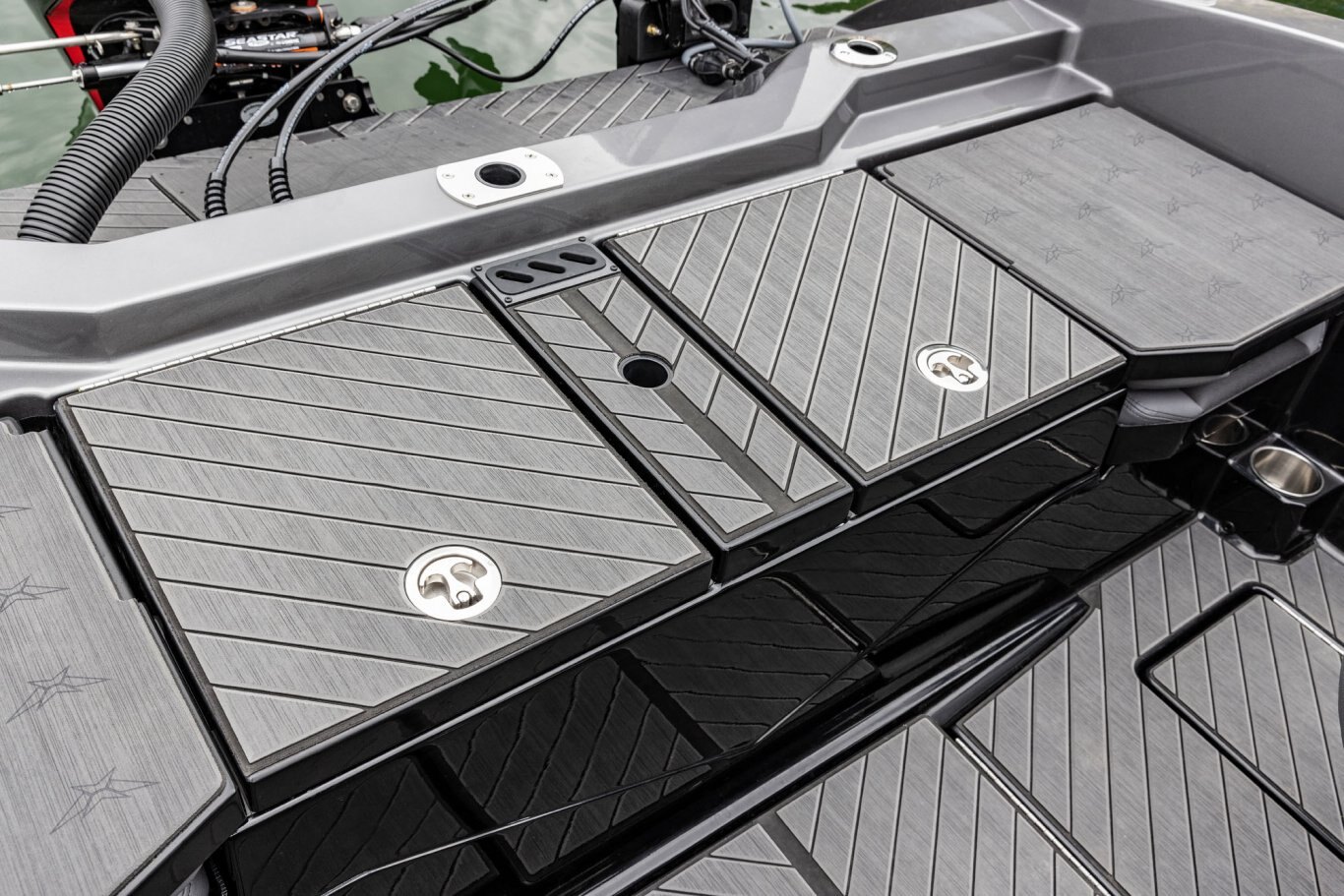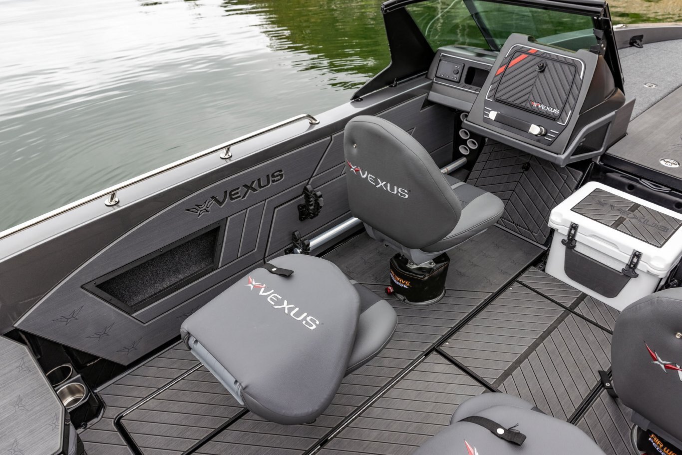 Near the Firm-Set™ windshield, a removable cooler serves double duty as a step to the front deck. You’ll also notice a pair of pullout storage bins just below the consoles. The port side is on a retracting slide and is ideal for holding up to six, 3700-style tackle trays. The corresponding compartment under the helm can hold even more of these boxes. It also works well as a catch-all or litter caddy. Looking aft, a pair of plush, jump seats are equally spacious. Flipped down, they help extend the rear deck. When completely up, you’ll find another set of sealed compartments that can also be used as coolers. In between these convertible seats is a tournament-level livewell with clear view lids for easy culling and quick checks of the catch.