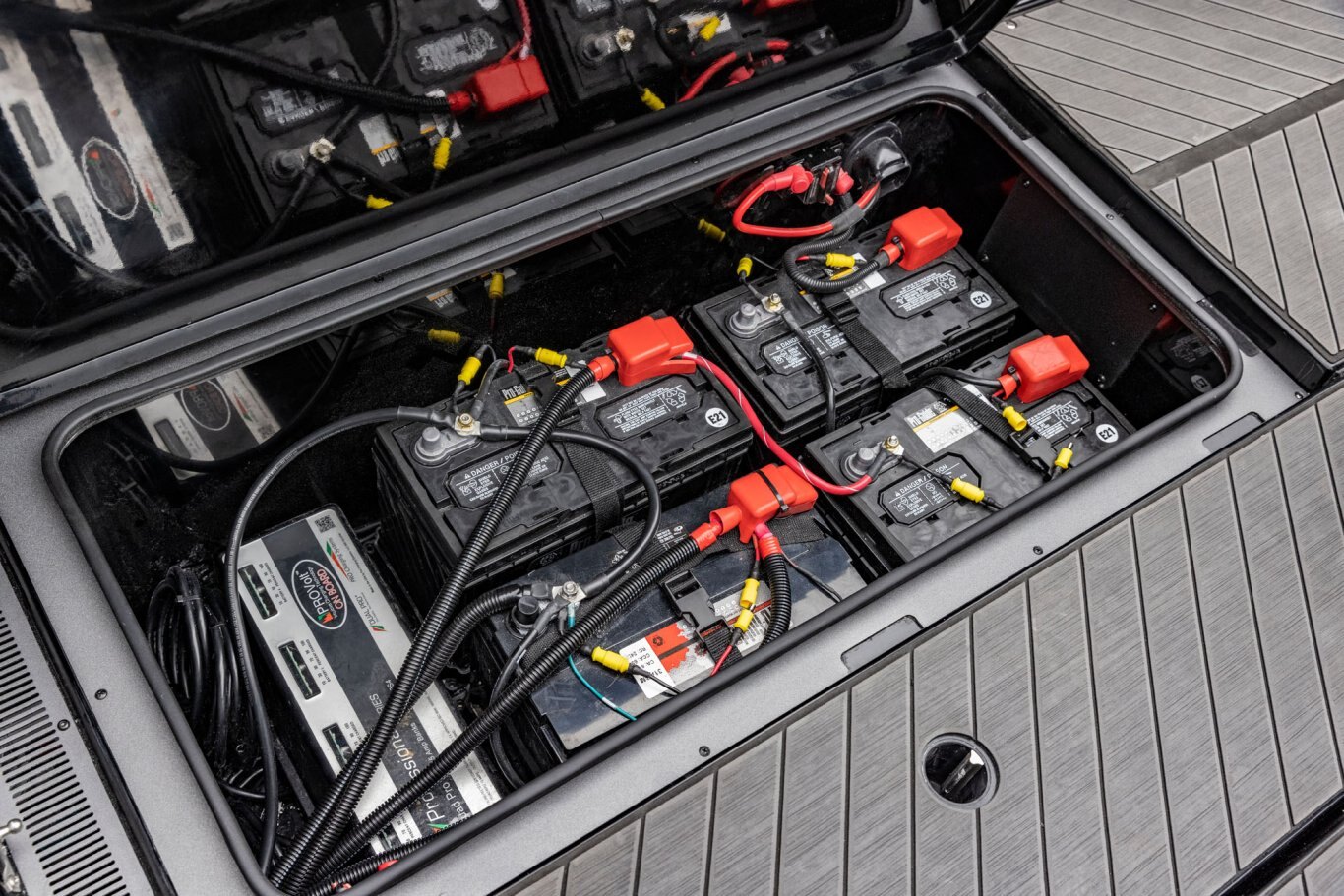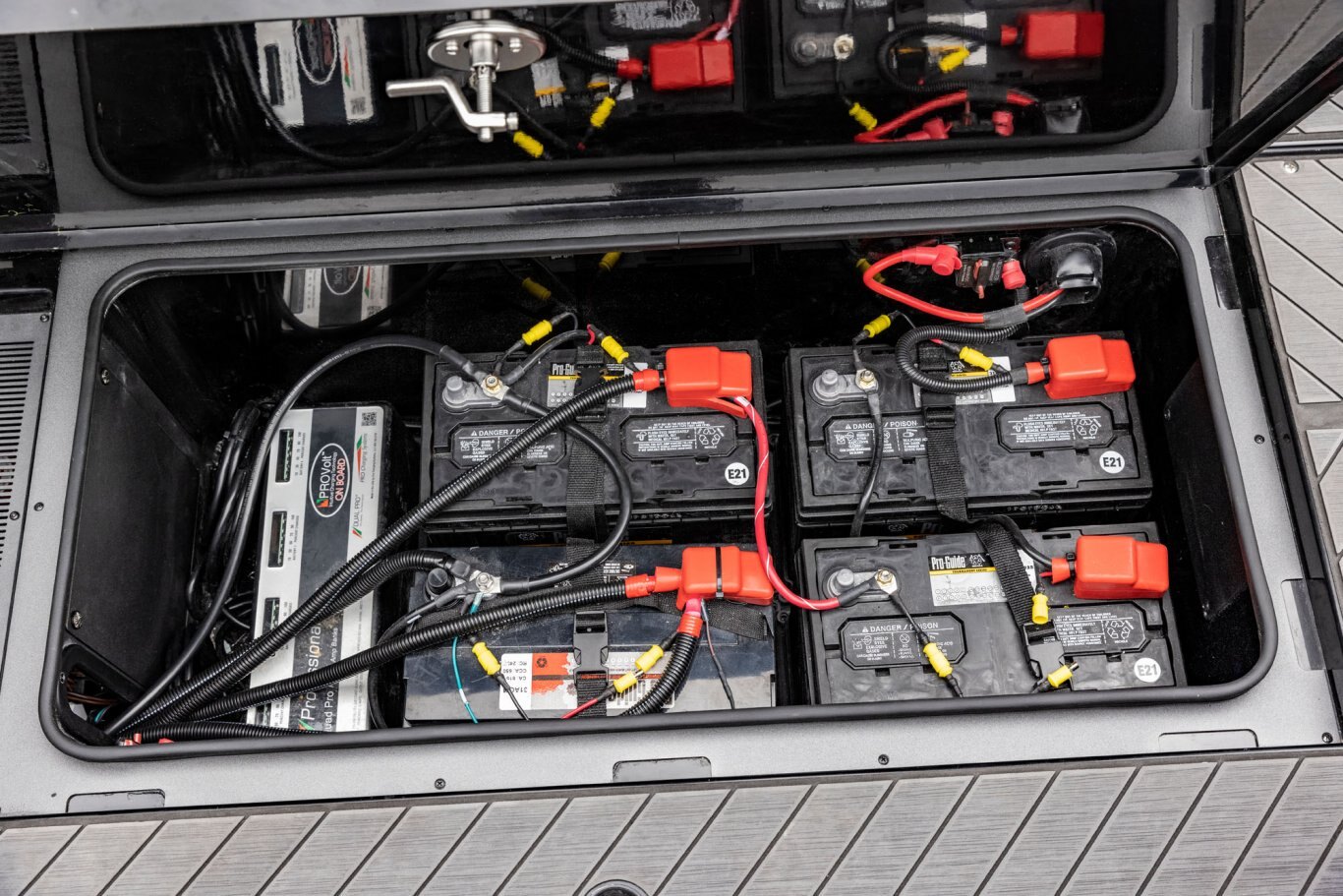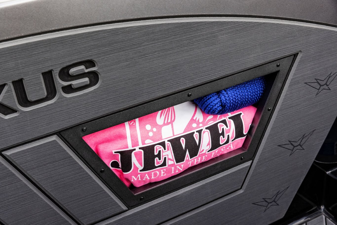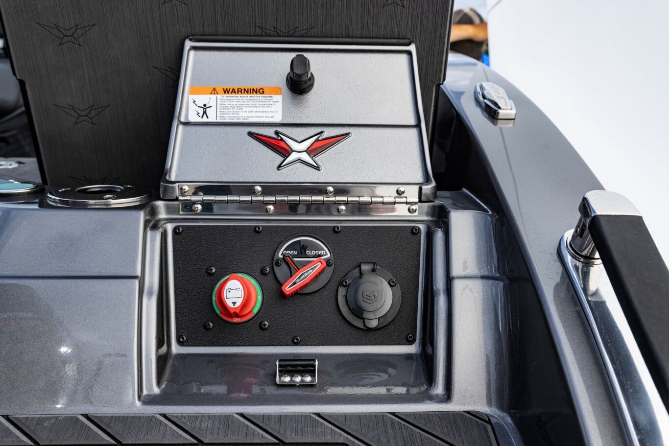 Near the Firm-Set™ windshield, a removable cooler serves double duty as a step to the front deck. You’ll also notice a pair of pullout storage bins just below the consoles. The port side is on a retracting slide and is ideal for holding up to six, 3700-style tackle trays. The corresponding compartment under the helm can hold even more of these boxes. It also works well as a catch-all or litter caddy. Looking aft, a pair of plush, jump seats are equally spacious. Flipped down, they help extend the rear deck. When completely up, you’ll find another set of sealed compartments that can also be used as coolers. In between these convertible seats is a tournament-level livewell with clear view lids for easy culling and quick checks of the catch.
