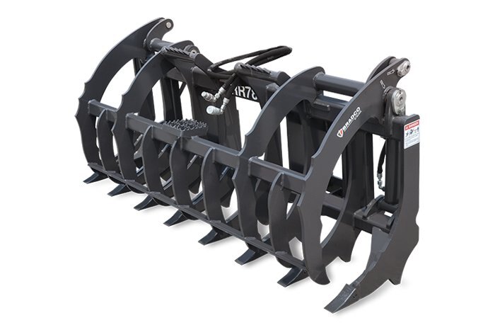 Root rake grapple primarily used for excavating and transporting roots and debris without extra dirt as well as raking, piling and loading debris. Doubles as a scarifier for busting up dirt clumps or loosening the ground. |
