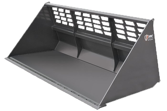 Snow bucket and universal mounting style designed to move large amounts of snow and other loose materials. The high back and straight edges help cut through snow and efficiently push materials.