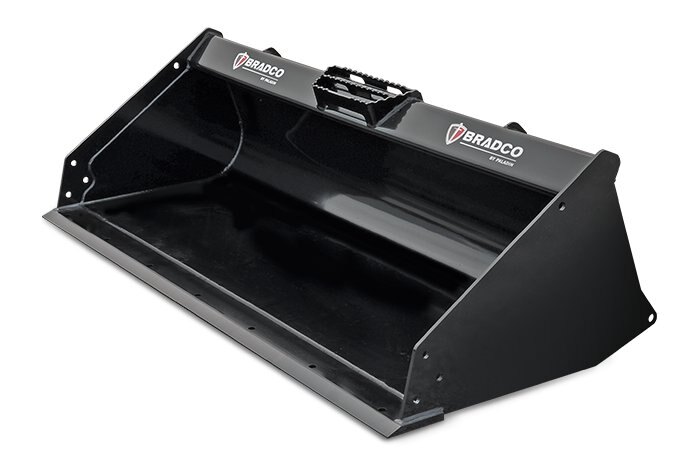 General purpose low profile bucket for skid steer and compact track loaders with pre-drilled holes for bolt on cutting edge and side cutters, standard floor. Used for scooping stone and dirt materials and for grading to level ground. Low profile bucket offers better visibility for the operator to the cutting edge of the bucket.