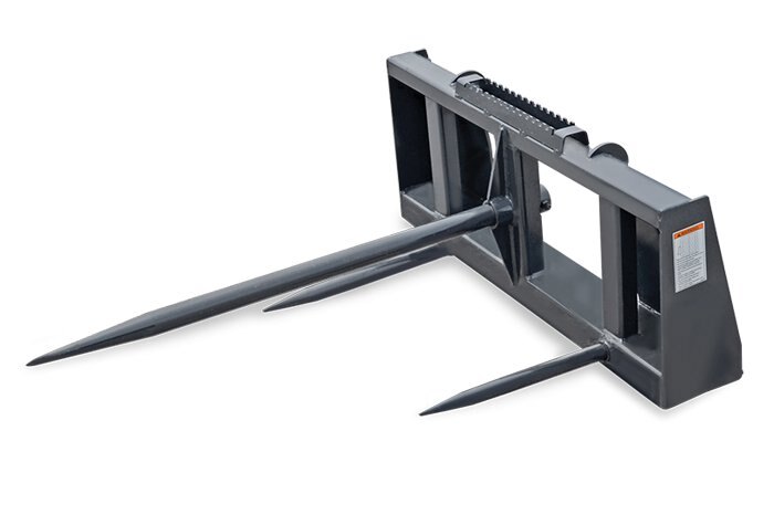 Round bale spear and universal attachment plate designed with one main spear and two stabilizer spears for easier and durable bale transport. |