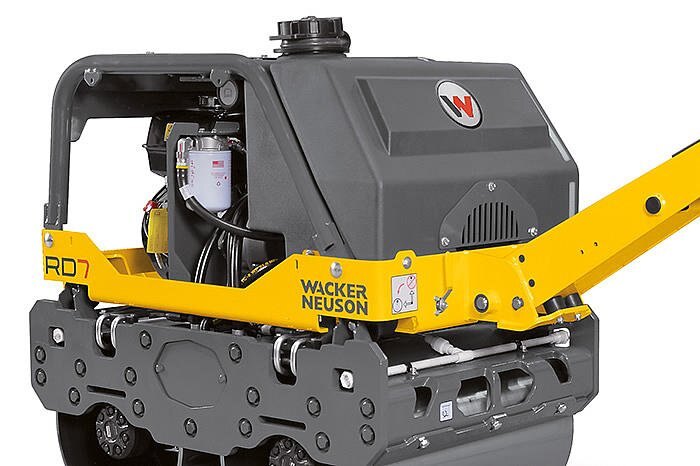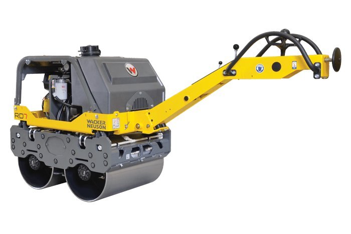The RD 7 walk-behind double drum vibratory rollers (tandem) are easy to maneuver while performing a wide range of soil and asphalt compaction applications. The exclusive compact design allows for tight side clearance on both sides of the roller. These versatile rollers, offer dual smooth drums with beveled edges to effectively compact asphalt and granular materials. The totally hydrostatic drive provides for less maintenance and greater reliability. Available with the choice of gasoline or diesel engines. Optional protection guard kit also available