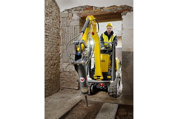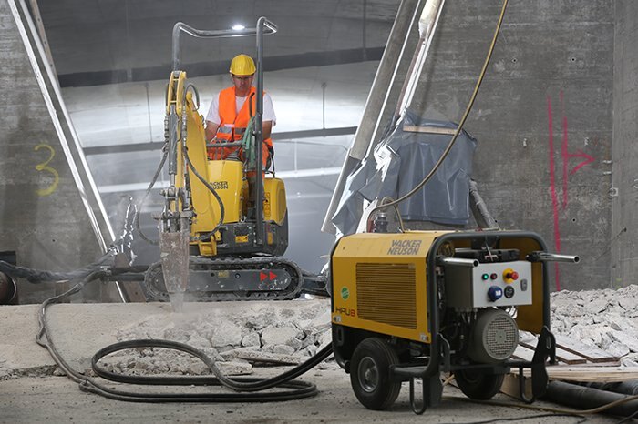 Two drive options: Diesel and electro-hydraulic drive Emission-free if necessary: For work indoors and in sensitive environments Consistent performance with both drives – even in breaker operation. Unrestricted work movements: Rotatable 360° with both drives Easy handling: Excavator weight, dimensions and machine center of gravity are unchanged
