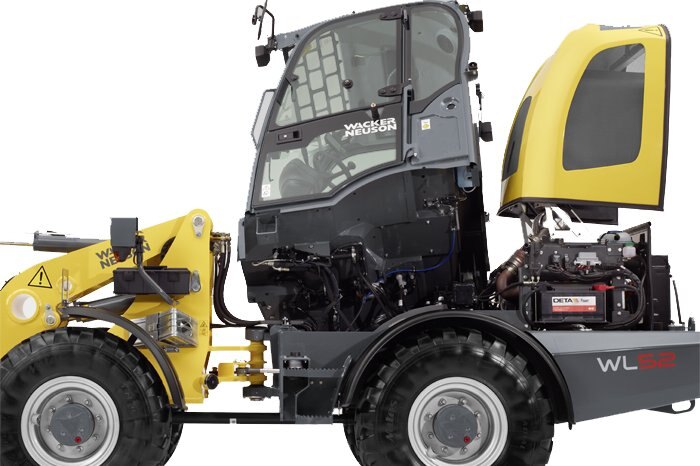 The WL 52 articulated wheel loader is the ideal machine for a variety of jobs. It is equipped with a 74-HP turbo charged Deutz T4F diesel engine. With standard auxiliary hydraulic flow of 18 gpm and high flow of 33 gpm (optional) allows for operation of high performance attachments. With travel speeds up to 19 mph, getting around the jobsite is extremely efficient. The operator's station is ergonomically laid out for the comfort and convenience of the operator, reducing fatigue and increasing productivity. Operating elements including a multifunctional single lever control and an additional lever for the third control circuit, are conveniently arranged next to the driver's seat for easy operation.