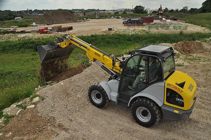 The 8085T telescopic all wheel steer wheel loader provides versatility when and where you need it most. This wheel loader offers a telescopic boom providing additional reach for stacking and dumping and excellent maneuverability with three steering modes. This all purpose wheel loader features a long wheelbase for smooth driving and easy handling even across rough terrain.