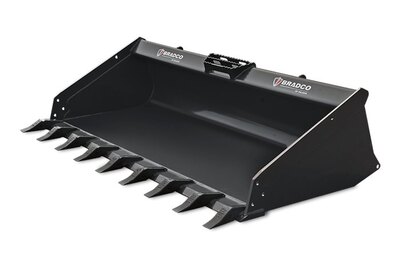 General purpose bucket with teeth, low profile and long floor for skid steer and compact track loaders; pre-drilled holes for and side cutters....