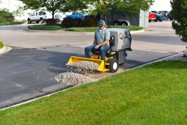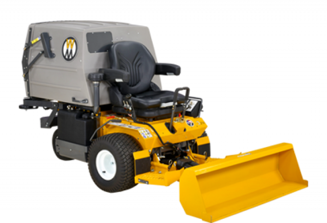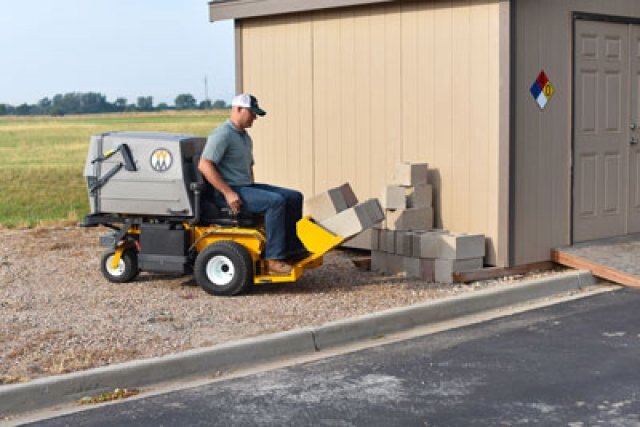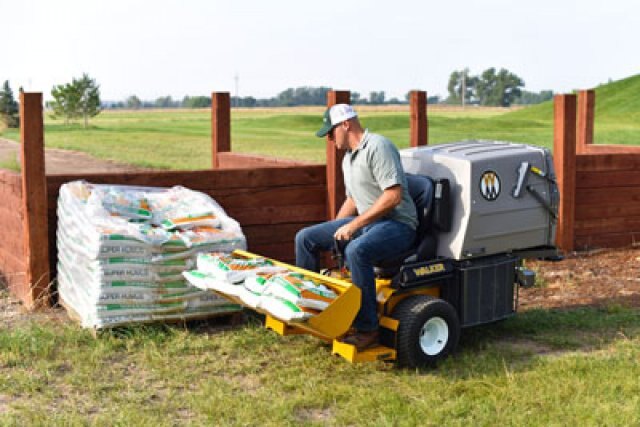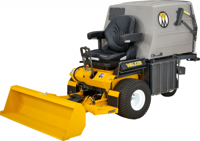 A versatile tool for landscaping work, the Loader Bucket will push, scoop, haul and grade dirt, stone, gravel and mulch. It lifts approximately 180lb (82kg) and holds 2.25 cu.ft (64 liter) of material, and features 14" ground clearance for transport. The Loader Bucket has a high strength steel cutting edge with tilting action, and is powered by a 500-lb electric ram, and is available for use on each Walker Mower except models S, B and H.