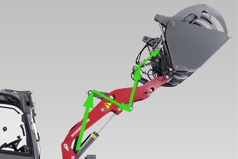 The angled loading arm is designed to be particularly sturdy and torsion resistant. At Weidemann, the kinematics are adjusted to the size of the machine: this ensures optimal balances of power for every machine. The P-Z kinematics is a combination of P-kinematics and Z-kinematics. It allows significant lifting and shearing forces and has a finely co-ordinated parallel motion in the process. |