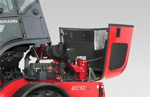 The engine hood can be opened backwards with just one handle for regular service and maintenance jobs. The hydraulic oil tank, air cleaner, engine oil filling, oil-level dipstick and coolant are therefore easily and quickly accessible. |