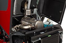 The engine hood can be opened upward with just one handle for regular service and maintenance work. The hydraulic oil tank, air cleaner, engine oil fill opening, oil-level dipstick and cooling water are therefore quickly and easily accessible. |