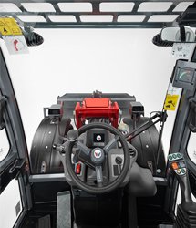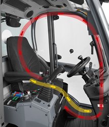 The spacious cabin meets the current European machine directive (2006/42/EC) according to ROPS and FOPS protection and offers a great deal of headroom and freedom of movement. Thanks to the complete glazing, the operator has an excellent overview of the attachments and the entire working area. |