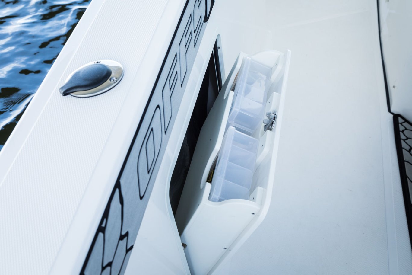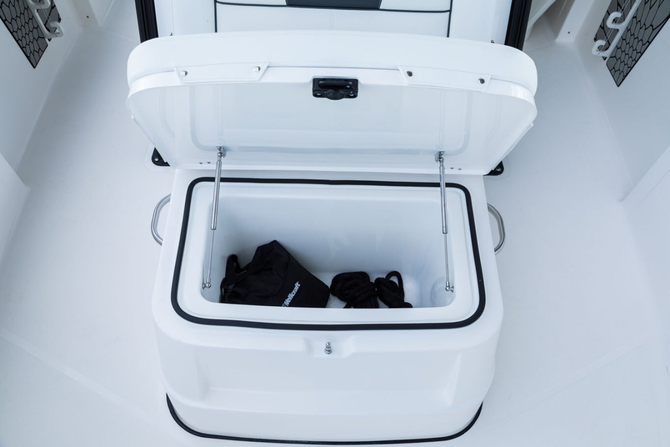 - Storage/fishbox(es), floor w/ macerator and overboard drain