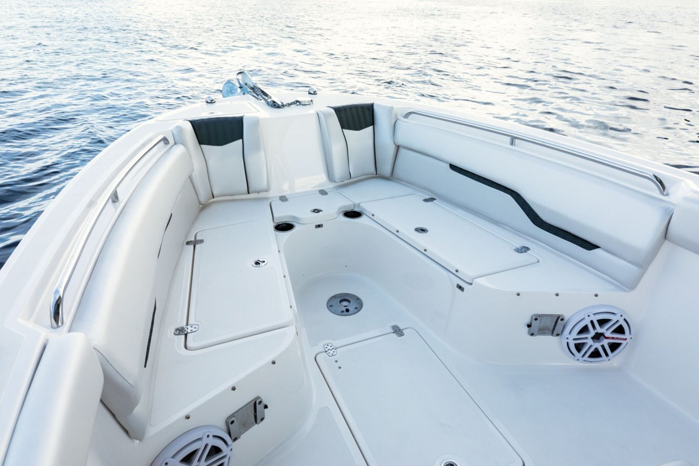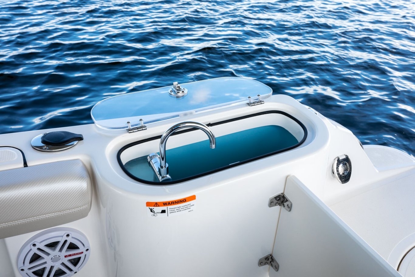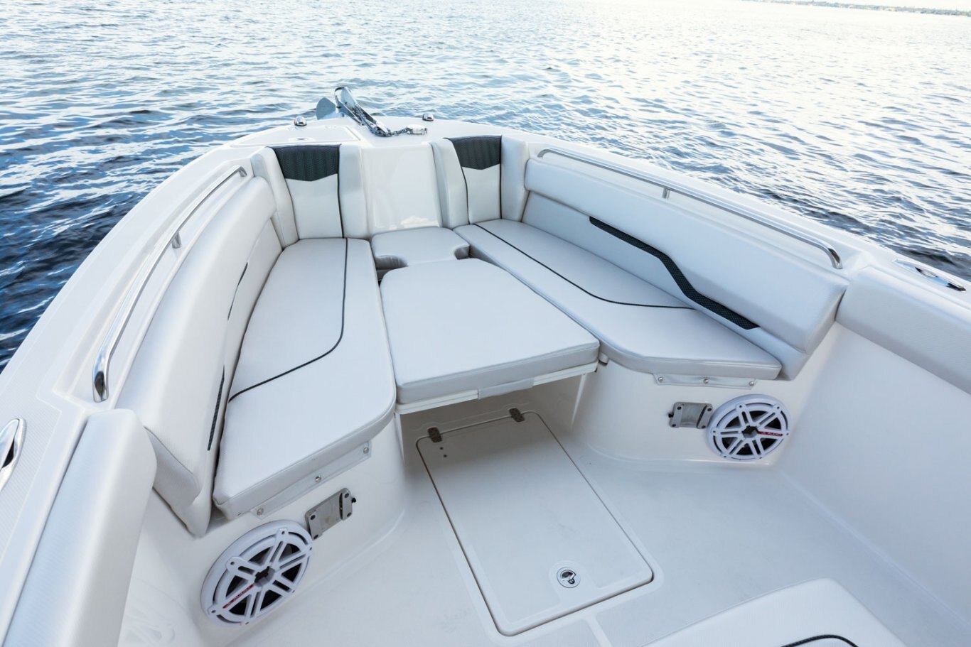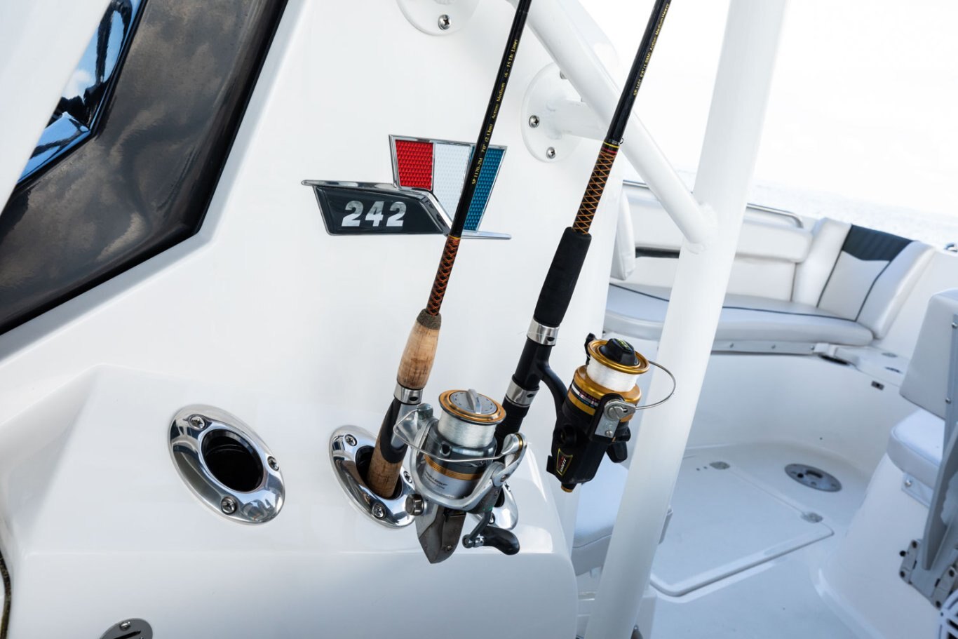 Whatever your passion: luxury fishing, family boating, or offshore cruising, the 242F embraces it all. Powered by single or dual applications, this 24'4" vessel delivers the length and muscle fishermen need when heading offshore—a textbook ride only possible through a high freeboard, deep hull, and an articulated bow flare.