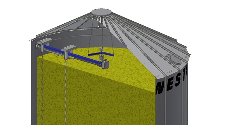 How Does It Work?The grain mixer moves in a unique circular stirring pattern to ensure consistent and proper grain stirring. Down augers are spaced 4.5' apart and effectively pull drier grain about 2' around the augers from the bottom of the bin to the top. Augers will move approximately 2' in or out with each revolution around the bin, covering a larger area to increase productivity. The outside auger of the grain mixer moves to within 12" of the bin walls eliminating the need for fixed down augers on the outside of the bin which improves airflow.