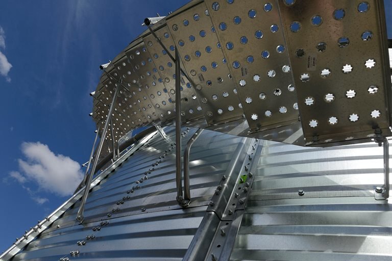 Westeel’s industry leading spiral staircase makes it easy to access the bin’s roof and inspection hatch safely.It can be installed ascending to the left or the right and features a continuous handrail its entire length. The top platforms can be installed at a full tier height location (in line with the eaves) or at a half tier height location (midway on the top tier). Westeel`s stair treads are a full 24” wide and stairs are spaced at six per bin tier, making ascension easier and reducing the likelihood of trips when descending. Sure footing is promoted through raised grips on every step, which also assist with proper drainage. |