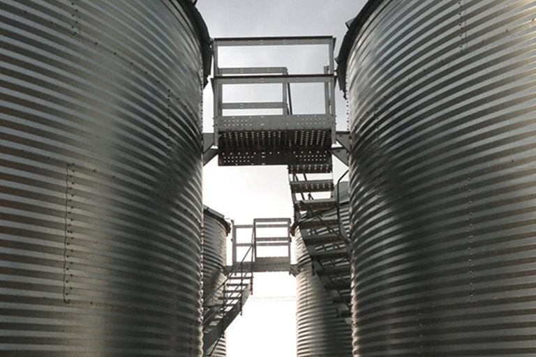 A number of platform packages are available for your Westeel bin including stand-off platforms that can be installed anywhere along the bin’s sidewall staircase to provide conveniently placed rest and work areas.An inter-bin platform can also be installed between the tops of two bins, allowing access to both bin roofs with a single staircase. |