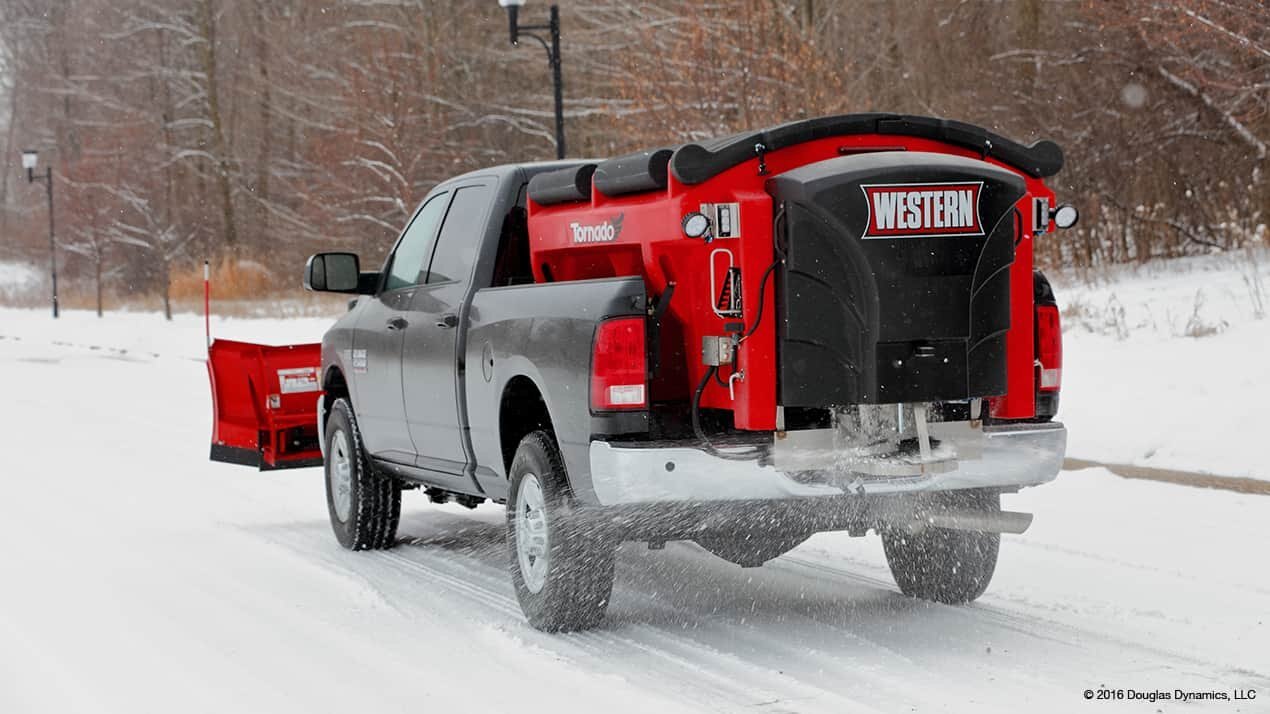 For reliable, low maintenance performance, the WESTERN® Tornado™ hopper spreader has a variety of features built to put more control at your fingertips, delivering efficient salt and sand spreading operation. The rugged, one-piece poly hopper includes overlapping lids to provide unsurpassed protection for your salt or sand load.