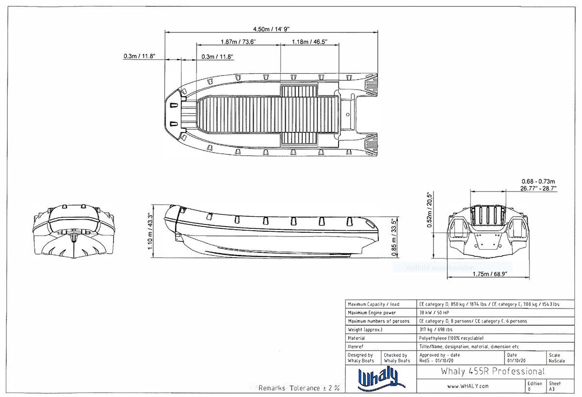 The Whaly 455 will also be available in two versions. The basic Whaly 455 and the Whaly 455R Professional. Whaly 455RProfessional model can be equipped with more horsepower than the basic version when higher speed is needed. The hull of the Whaly 455R Professional is produced with extra polyethylene and therefore thicker and more robust which makes it suitable for boating in demanding conditions.