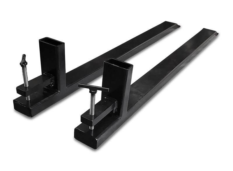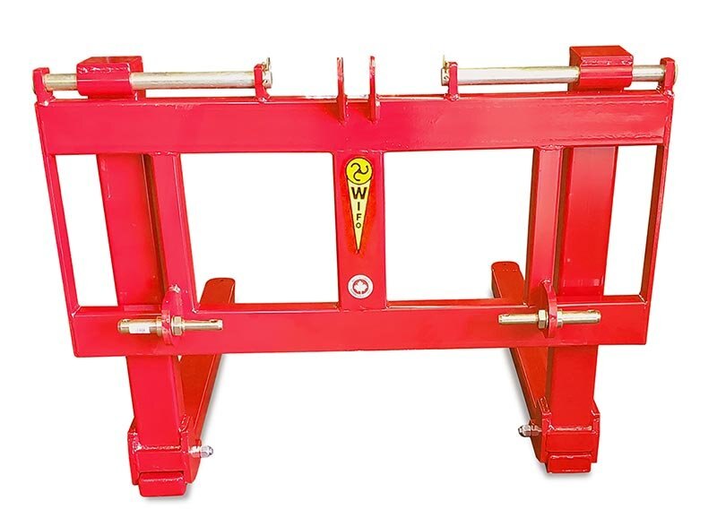 3 point hitch Pallet forks with adjustable non folding tines, Category 1 and 2, 3 point hitch mount, Fork length: 42” or 48” Fork spacing: 12” to 36” In between Capacity: 2500 lbs Weight: 350 lbs