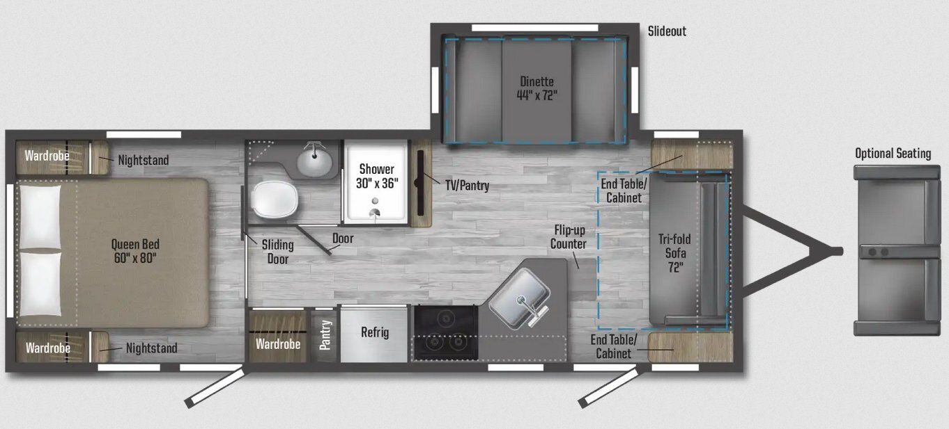 Front living room floorplan with dinette slideout and rear queen bed. |