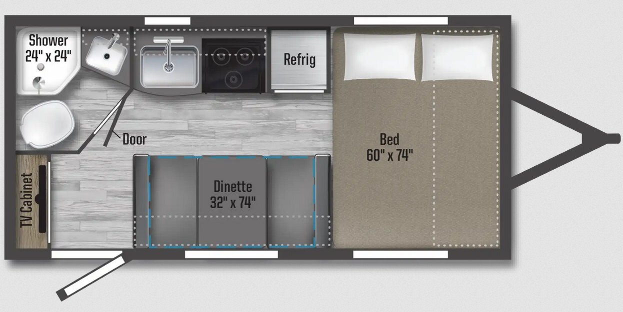 No slideout floorplan with corner dry bath and spacious sleeping up front. |