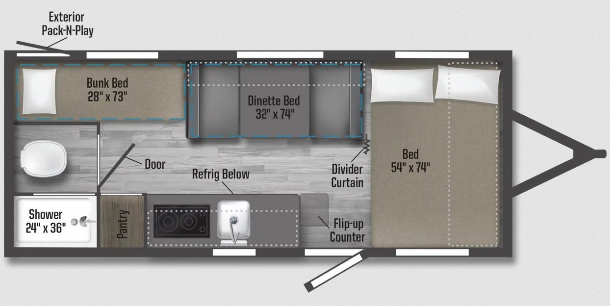 Single axle floorplan with bunk beds and no slideout. |