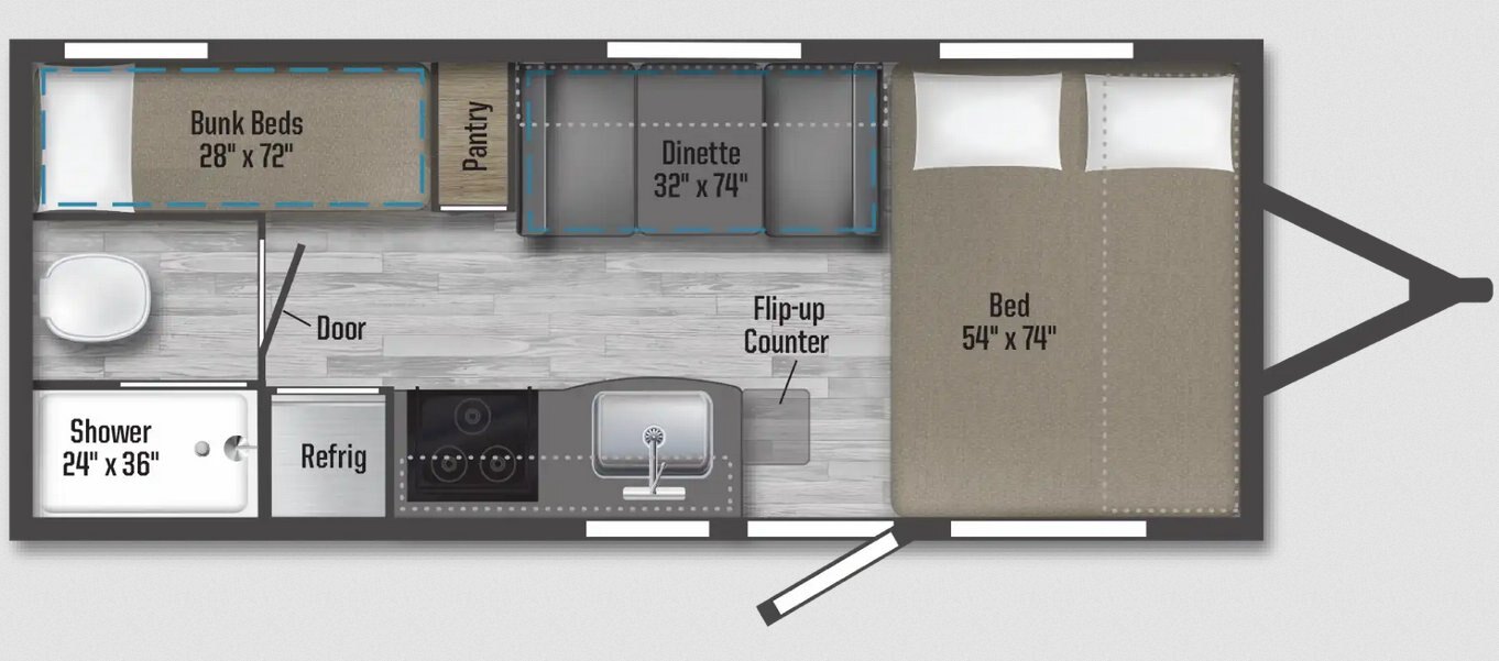 Dual axle bunk model with front sleeping and dinette; no slideout. |