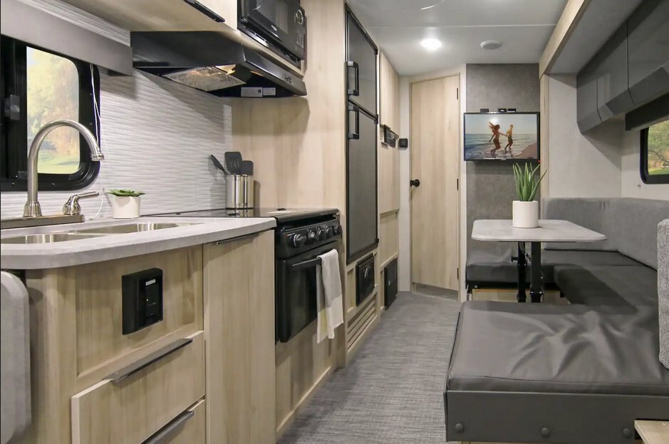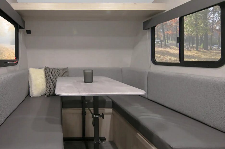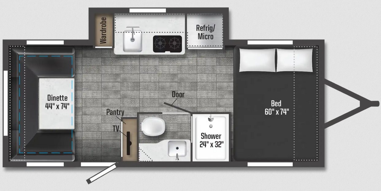 A single-axle floorplan featuring a U-shaped dinette, slide out, dry bath and sleeping in the front. |