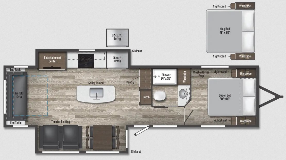 Front true queen bed floorplan with a spacious bathroom, theater seating and a table with 4 chairs in one slideout, a large galley with an island and entertainment center in the opposing slideout, and rear tri-fold sofa. |
