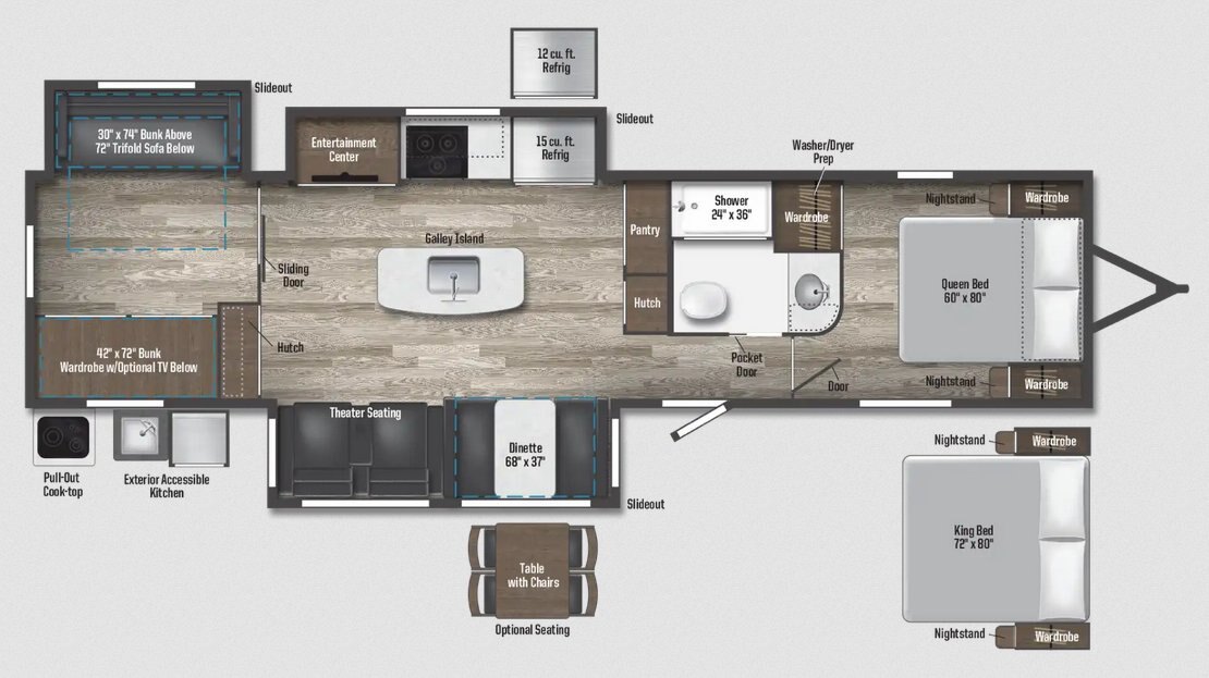 Front true queen bed floorplan with a spacious bathroom, theater seating and dinette in one slideout, an entertainment center and large galley in the opposing slideout, a large bunkhouse with additional bunk above tri-fold sofa in the rear slideout, and an outdoor kitchen. |
