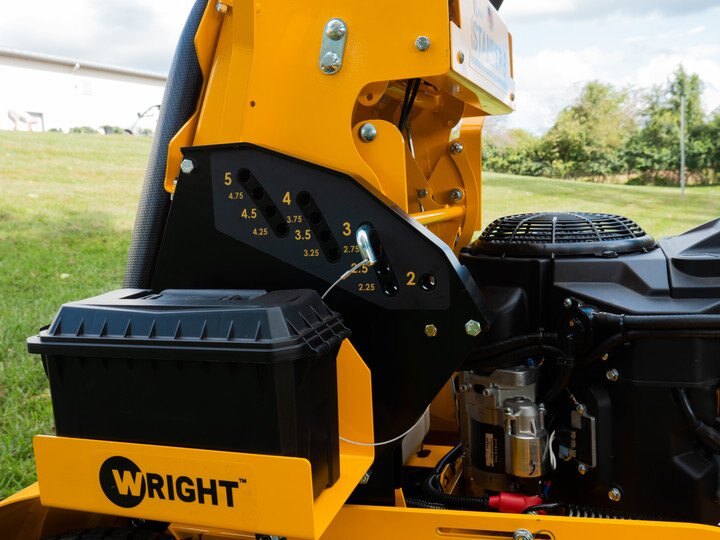 The Wright Parts Stander ZK, X, and Intensity models are equipped with a push button deck adjust. This allows us to use strong springs to make it easier for you to raise and lower the deck while preventing the deck from jumping up and down when traveling over bumpy ground. This system also makes it easier to temporarily raise the deck in ¼'' increments without resetting the height select pin. |